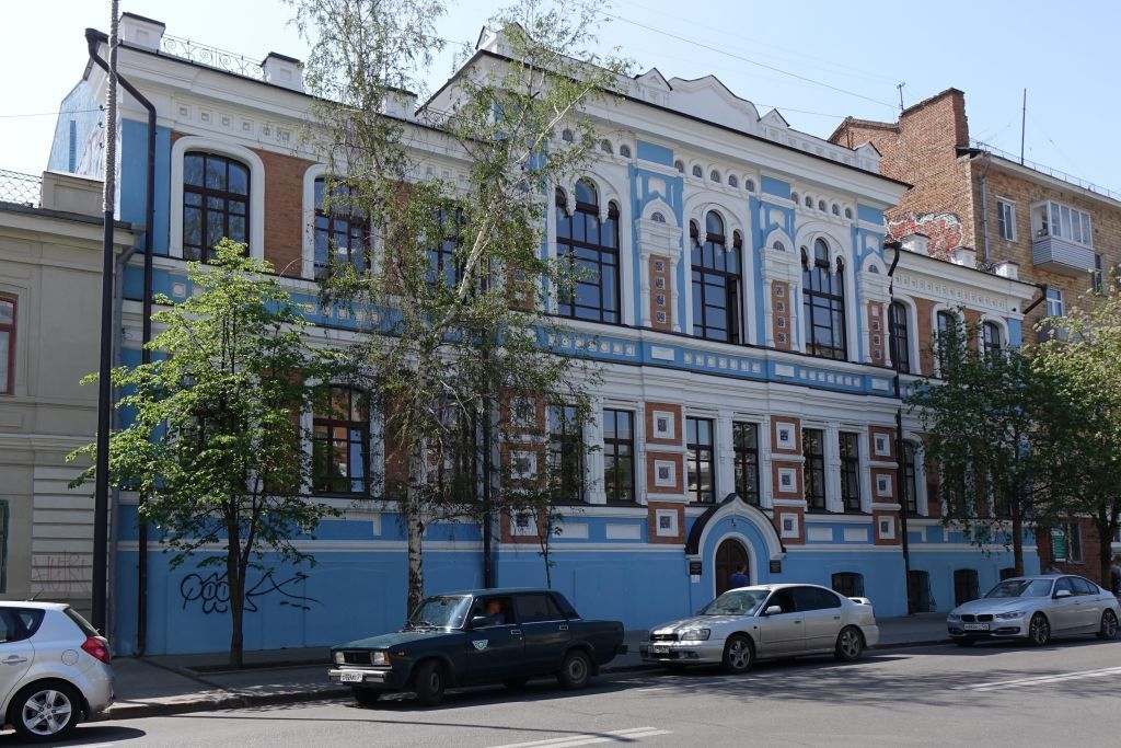1. Местоположение, роль и градостроительные характеристики зданияВместе с примыкающими с запада и востока зданиями формирует значительный участок застройки исторического центра в границах квартала, ограниченного пр. Мира, ул. Сурикова, ул. Карла Маркса и ул. Парижской Коммуны. Здание выходит на пр. Мира северным фасадом, решённым в 9 осей. К глухим торцам здания примыкают корпус прогимназии (с востока) (впоследствии жилой и хозяйственный корпус епархиального училища) и пятиэтажный жилой дом (с запада).2. Объёмно-пространственная композиция здания на нач. ХХ в. Кирпичное, двухэтажное, с высоким цокольным этажом здание, прямоугольное в плане, имеет чёткую симметричную композицию. В убранстве главного фасада использованы элементы неорусского стиля. Вход с улицы ведёт в небольшой вестибюль с оригинальной парадной лестницей, под её площадкой находится спуск в цокольный этаж. Ещё две лестницы, объединяющие все три этажа, расположены в северо-восточном и юго-западном углах здания. Во всех этажах по продольной оси здания расположен широкий коридор, расчленённый двумя высокими арками. В верхних этажах находятся по четыре классных комнаты. Во втором этаже в подвышенном объёме расположен большой зал с двумя столбами посередине. Коридор цокольного этажа перекрыт полуциркульным сводом с арками и распалубками. В северо-восточной части цокольного этажа устроено убежище – заложены окна, усилено перекрытие. Выполненный из фигурного кирпича и оштукатуренный декор фасадов окрашен в белый цвет. Основное поле фасада выполнено лицевой кирпичной кладкой.3. Южный фасад3.1. Композиция южного фасада на нач. ХХ в. Фасад симметричный, решён в 9 осей. Крайняя левая ось – крупное двухсветное окно полуциркульного завершения, под которым расположен вход. Остальные окна фасада – прямоугольные.3.2. Оконные и дверные проёмы на нач. ХХ в.Форма, местоположение и размер оконных проёмов.3.3. Декор южного фасада на нач. ХХ в.:широкий профилированный междуэтажный карниз;подоконные тяги обоих этажей;широкие наличники окон (профилированные – у окон первого и второго этажей, гладкие – у окон подвала);филёнки под окнами первого этажа;ряды ширинок с дисками под окнами второго этажа;венчающий карниз с рядом ступенчато заглублённых квадратных филёнок фриза.4. Северный фасад4.1. Композиция северного фасада на нач. ХХ в.Фасад симметричный. Ризалит в уровне цокольного этажа решён в 3 оси. По центральной оси расположен главный вход, фланкированный окнами цокольного этажа. Первый этаж ризалита решён в 6 осей, второй этаж решён в 3 оси крупных окон. Каждое боковое крыло решено в 3 оси.4.2. Оконные и дверные проёмы на нач. ХХ в.Форма, местоположение и размер оконных и дверного проёмов.4.3. Декор северного фасада на нач. ХХ в.Центральный повышенный ризалит увенчан фигурным аттиком с рядом ступенчато заглублённых квадратных филёнок. Под массивным карнизом проходит отделённый профилированной тягой фриз с рядом арочек-кокошников. В коробовые завершения больших оконных проёмов парадного второго этажа, обрамлённых широкими наличниками, вписаны тройные подвесные арки с «гирьками». В простенках расположены широкие лопатки, каждая из которых украшена парой колонок с перехватами, объединённых широким антаблементом, увенчанным кокошником. В первом этаже лопатки расчленены горизонтальны