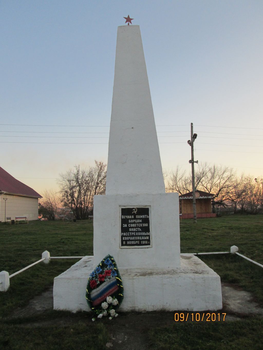 1. Местоположение объектаОбъект расположен в центре с. Каратузское Каратузского района. 2. Памятник2.1. Тип памятникаОбъект представляет собой четырехгранный обелиск в виде усеченной пирамиды, завершенный уплощенной пирамидой, стоящий на постаменте в форме прямоугольного параллелепипеда. Постамент опирается на прямоугольное основание. Обелиск увенчан металлической пятиконечной звездой. Размеры: высота обелиска – 4,04 м, постамента – 1,4 м, основания – 0,56 м; размеры основания– 2,8 х 2,8 м, постамента – 1,65 х 1,65 м, обелиска – 1,2 х 1,2 м. 2.2. Техника и материалы памятникаПамятник выполнен из бетона, мемориальная доска из металла.2.3. Особенности обработки поверхности Памятник оштукатурен и окрашен.2.4. Надписи с оригинальными названиями композиций и тексты, введенные в состав памятникаС северной стороны на постаменте, в неглубокой нише, размещена мемориальная доска со знаком серпа и молота вверху и с надписью: «ВЕЧНАЯ ПАМЯТЬБОРЦАМЗА СОВЕТСКУЮВЛАСТЬ,РАССТРЕЛЯННЫМКОЛЧАКОВЦАМИВ НОЯБРЕ 1918 г.».3. Историческое (мемориальное) значениеПамятник истории, связанный с событиями Гражданской войны на территории Красноярского края.4. Художественная ценностьНадмогильное сооружение, выполненное в формах воинского захоронения.