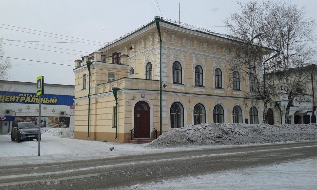 1. Местоположение, роль и градостроительные характеристики зданияКаменное трёхэтажное здание на высоком полуподвале, крытое железной вальмовой крышей, формирует главную улицу города. Одно из самых высоких зданий в городе.2. Объёмно-пространственная характеристика усадьбыКаменное двухэтажное здание с подвалом и антресолями, пятиосным фасадом выходит на южную линию застройки ул. Ленина. К южному фасаду примыкает крупная лестничная пристройка на всю высоту дома с деревянной лестницей на антресоли и чёрным входом на второй этаж. Парадная лестница занимает южную часть восточной пристройки, над ней сохранились тумбы ограждения балкона-террасы антресолей. Фасад удлиняется восточной и западной одноэтажными пристройками в один проём. Оштукатуренные фасады увенчаны деревянным профилированным карнизом большого выноса, с лепными кессонами по софиту.3. Условия зрительного восприятия Расположен на южной стороне ул. Ленина в квартале, ограниченном пер. Партизанский – ул. Ленина – ул. Горького – ул. Кирова. Хорошо просматривается с моста через р. Мельничную.4. Колористическое решениеСтены оштукатурены, окрашены в жёлтый цвет с белыми деталями. Цвет кровли и элементов водосточной системы зелёный (ярь-медянка). 5. Южный фасад на 1860–1870 гг.5.1. Композиция южного фасада:высотная отметка карниза, форма крыши, высотная отметка конька;асимметричная композиция фасада в четыре оконных оси;с запада и востока примыкают одноэтажные в одну ось пристройки;оштукатуренный и побеленный фасад увенчан подшивным карнизом большого выноса;фриз выделен профилированными штукатурными тягами;окна второго этажа имеют большую высоту, чем окна первого этажа;окна завершены перемычками лучкового типа;горизонтальные членения выделены профилированными тягами междуэтажного карниза между 1 и 2 этажами.5.2. Декоративное оформление южного фасада:профилированные наличники оконных проёмов.6. Западный фасад на 1860–1870 гг.6.1. Композиция западного фасада:высотная отметка карниза, форма кровли, высотная отметка конька;асимметричная композиция фасада в четыре оконных оси;окно на третьей оси сдвоенное;оштукатуренный и побеленный фасад увенчан подшивным карнизом большого выноса; фриз выделен профилированными штукатурными тягами; окна второго этажа имеют большую высоту, чем окна антресольного этажа.6.2. Декоративное оформление западного фасада (без пристройки):софит карниза украшен лепными филёнками;карниз поддерживают массивные фигурные кронштейны фриза с филёнками между ними, украшенными чередующимися лепными деталями растительного орнамента и гирляндами; проёмы второго этажа обрамлены узкими архивольтами с замком и «ушами», на которые оперты высокие плоские кронштейны, на которые, в свою очередь, опираются сандрики, включённые в раскрепованную многообломную надоконную тягу, отделяющую ярус антресолей;наличники, замковые камни, кронштейны наличников второго этажа украшены тонкой лепниной и фигуркой филенкой с гирляндой;междуэтажная подоконная тяга раскрепована по тумбам, под окнами – плоские филёнки.7. Северный фасад на 1860–1870 гг.7.1. Композиция северного фасада:симметричная композиция фасада в семь осей, две из них в пристройках;окна завершены перемычками арочного типа;в пристройках расположены входы в здание; пристройки завершены парапетом в виде прям