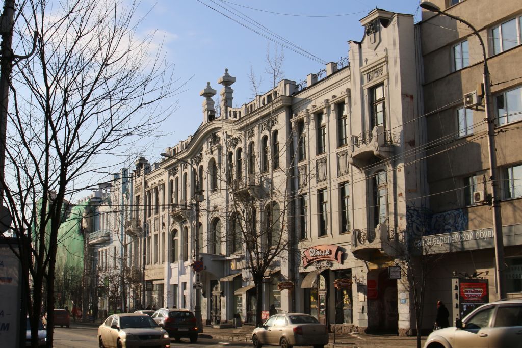1. Местоположение, роль и градостроительные характеристики здания:Здание расположено в историческом центре города в границах квартала, образованного пересечением пр. Мира - ул. Диктатуры пролетариата - ул. Ленина - ул. Кирова. Формирует значительный участок северной стороны пр. Мира и значительную часть квартала. Протяжённым южным фасадом выходит на линию застройки пр. Мира. К его глухим торцам примыкают соседние здания.2. Объёмно-пространственная композиция здания:Трёхэтажное кирпичное здание с подвалом, прямоугольное в плане, с примыкающим с севера складским корпусом и слегка выступающими тремя ризалитами на уличном фасаде, выполнено в стиле модерн.Планировка первого и второго этажей анфиладная. Внутренняя продольная стена вычленяет переднюю половину с крупными залами. Планировка третьего этажа коридорного типа.Во двор ведёт проездная арка, соответствующая оси восточного ризалита главного фасада.3. Южный фасад:3.1. Композиция южного фасада на нач. XX в.:Симметричен, решён в 15 осей.Средний 7-осный ризалит увенчан двумя высокими тумбами с вазонами.В композиции боковых одноосных ризалитов включены вход (слева) и арочный проезд во двор (справа), балконы на кронштейнах.Участки фасада, расположенные между ризалитами, решены в 3 оси.Окна подвального этажа со стороны пр. Мира расположены в приямках.Форма, местоположение и размер оконных проёмов.3.2. Декор южного фасада на нач. XX в.Средний 7-осный ризалит увенчан двумя высокими тумбами с вазонами, расположенными выше широкого лучкового подвышения карниза, под которым на массивном наличнике центрального крупного окна третьего этажа размещён маскарон в виде крупной женской маски.Линию подвышения карниза центрального ризалита повторяет каменный парапет, в фигурных прорезях которого расположены кованые металлические решётки рисунка в стиле «модерн», такие же решётки расположены между венчающими тумбами.Во втором этаже центрального ризалита расположены широкие окна-витрины коробового завершения, в верхней части их наличников расположен лепной элемент растительного рисунка с маскароном в виде женской маски в центре.Над окнами третьего этажа, частично сдвоенными, в фигурном углублении фасада размещены лепные элементы, изображающие стилизованное расцветшее дерево, крона которого переплетена с лентами модернового рисунка.Ниже карниза по междуоконным лопаткам спускаются декоративные накладки.В композиции боковых одноосных ризалитов включены вход (слева) и арочный проезд во двор (справа), балконы на кронштейнах плавных очертаний с легкими металлическими решётками между фигурными тумбами.Боковые ризалиты завершены фигурного очертания щипцами с геральдическими картушами в центре.На трёхосных участках между ризалитами окна объединены по вертикали общими наличниками, охватывающими и межоконные филёнки с включёнными в них барельефными изображениями драпировок.Все проёмы-витрины первого этажа прямоугольные с металлическими жалюзи.Цоколь облицован крупными гранитными блоками.Окна подвального этажа со стороны пр. Мира расположены в приямках.Фигурные переплёты окон верхних этажей.Остеклённые шары-глобусы над боковыми ризалитами (утрачены).4. Северный фасад4.1. Композиция северного фасада на нач. XX в.Трёхчастная композиция фасада.Средний блок выше боковых и завершён волно