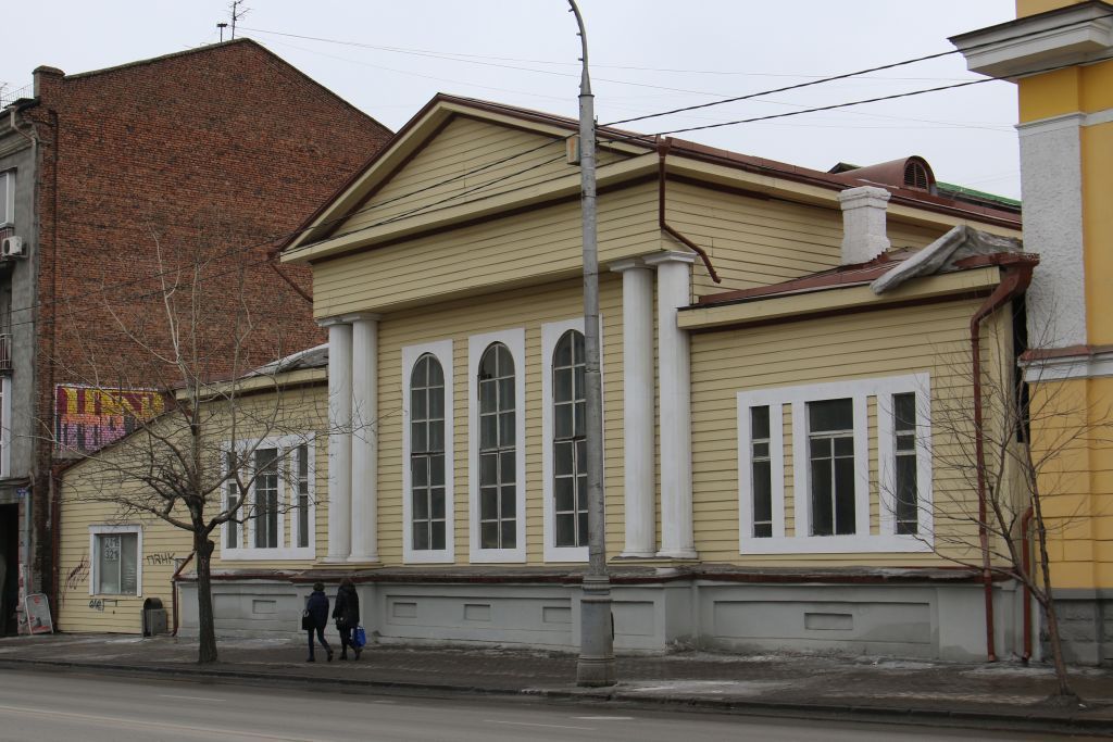 1. Местоположение, роль и градостроительные характеристики зданияЗдание расположено в историческом центре города, северным фасадом выходит на красную линию застройки проспекта Мира, с востока и запада вплотную примыкает к зданиям периметральной застройки квартала.2. Объёмно-пространственная композиция здания на нач. ХХ в.Одноэтажное бревенчатое здание, прямоугольное в плане, на высоком каменном оштукатуренном цоколе. Повышенный центральный объём здания под двускатной крышей фланкирован пониженными боковыми объёмами под трёхскатными крышами.В восточной части здания со стороны главного северного фасада устроено крыльцо главного входа, которое в настоящее время утрачено.Планировка здания имеет трёхчастную структуру, соответствующую членениям фасада: по сторонам большого высокого зала расположены помещения – прихожая, гостиные, диванные, которые соединены друг с другом анфиладно.Поле стен окрашено в цвет жёлтой охры. Детали выделены более тёмной краской. Кровля и металлические детали фасадов окрашены в красно-коричневый цвет (сурик железный). Цоколь и дымовые трубы окрашены в белый цвет.3. Северный фасад3.1. Композиция северного фасада на нач. ХХ в.Три высоких окна с полуциркульным завершением размещены между колоннами портика центрального объёма здания. На пониженных объёмах расположены симметричные композиции из трёх вертикальных прямоугольных окон, среднее из которых более крупное.Повышенный центральный объём здания, соответствующий главному залу, акцентирован выносом цоколя, несущим упрощенный портик из двух пар приставленных к стене колонн фронтона, поднятого над антаблементом. Утраченное крыльцо восточного парадного входа акцентировано двускатным козырьком с двумя тумбами.Форма, местоположение и размер оконных и дверного проёмов.3.2. Декор северного фасада на нач. ХХ в.Поле стен фасада в горизонтальном направлении обшито тёсом.Высокий цоколь оштукатурен и завершён карнизом простого профиля.Прямоугольной формы филёнки с узкими продухами подвала, соответствующие осям окон, расположены в цоколе.Прямоугольной формы филёнки цоколя, соответствующие расположению спаренных колонн.Антаблемент гладкий.Колонны обшиты вертикальным тёсом.Окна обрамлены широкими плоскими наличниками, поддерживающими прямой сандрик с зубчиками, и охвачены общим обводом сложного очертания. На пониженных крыльях тройные окна имеют подобные, но более простые обрамления.Восточный (утраченный) вход оформлен двускатным козырьком, украшенным пропильной резьбой, и акцентирован двумя высокими фигурными тумбами со шпилями.4. Интерьеры на нач. ХХ в.Потолочно-стеновые тяги и потолочные розетки расположены во всех помещениях здания.Филёнчатые деревянные двери.Обрамление оконных и дверных проёмов.