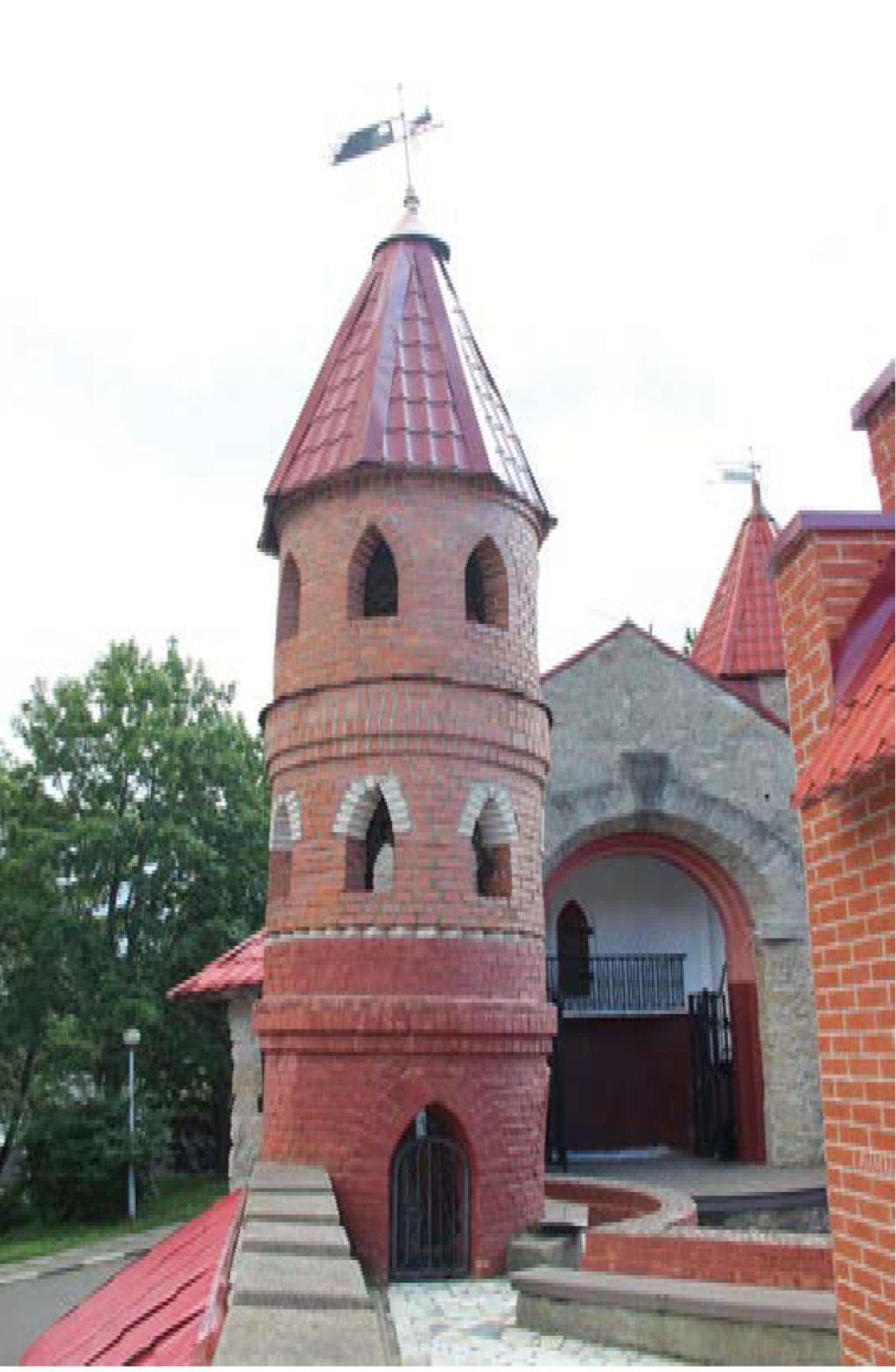Объемно- пространственное решение:Трехъярусная кирпичная круглая в плане башня с восьмигранным шатровым завершением.Высотные отметки по карнизам и коньку кровли.Конструктивная система:Кладка стен башни из кирпичаАрхитектурно-художестве иное решение фасадов:Открытая кирпичная кладка Дверные и оконные проемы — местоположение, конфигурацияИсторический материалкровли — керамическая черепица (утрачен).Кованный флюгер восточной башни (коршун).