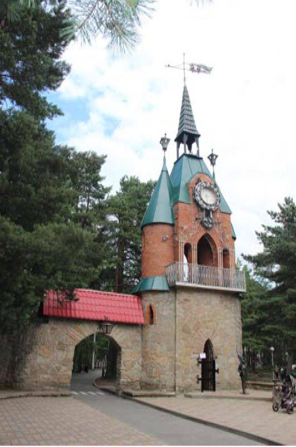 Объемно-пространственное решение:Двухъярусная башня, прямоугольная в уровне первого яруса, вытянутая по оси восток-запад с закругленными углами, имитирующими полукруглые башни, с арочным проходом в боковой части первого яруса.Шатровое покрытие башен.Конструктивная система:Стены, сложенные из красного кирпича, с облицовкой первого яруса блоками известняка.Высотные отметки по коньку кровли. Башни перекрыты четырехгранными шатрами, центральные выше двух боковых.Архитектурно- художественное решение фасадов:«Рваная» техника обработки известковых блоков кладки стен первого яруса.Кладка остальной части здания из красного кирпича.Дверные и оконные проемы - местоположение, конфигурация балкона во втором ярусе башни - конфигурация; металлическое художественное ограждение.Металлические кованые ворота дверного проема.Башенные часы на южном фасаде Навершия боковых башен в виде кованых фонарей.Завершение центральной башни в виде четырехгранного шатра на 4 металлических столбиках, с чешуйчатым открытием шатра кованый флюгером на вершине (солнце).