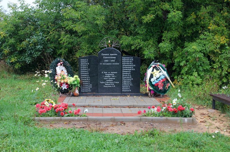 Памятник-стела Героям Советского Союза: Зайцеву Василию Михайловичу и Ращупкину Андрею Ивановичу совершившим подвиг и погибшим в бою в этой деревне в декабре 1941 г. Останки героев захоронены в г. Тихвине