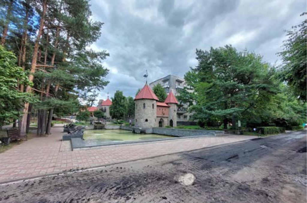 Объемно- пространственное и планировочное решение территории:Местоположение сложного в плане игрового комплекса в 3-м микрорайоне г. Сосновый Бор, с входом с ул. Солнечной; Общее архитектурно художественное решение комплекса в виде имитации средневекового замка со сказочными мотивами в оформлении.Местоположение памятников, их конфигурация.Конфигурация и местоположение трассы автотрека.Конфигурация и местоположение лестниц.Конфигурация, высота, материал и местоположение подпорных стенок: - Низких, сложенных и камня с гранитным парапетом. низких, кирпичных с гранитным парапетом.- разновысотных из валунов.-каменных гладких и со стрельчатыми проемами.- центральная подпорная стена из кирпичной и валунной кладки с шестью нишами.Архитектур не художественное решение фасада центральной подпорной стенки:6 мозаичных панно на восточной стене комплекса в нишах, облицованных камнем.Местоположение, материал (мозаика)Малые формы:Декоративный арт- объект — скамья и зонт с цветными секциями.Местоположение, материал (металл, стекло)