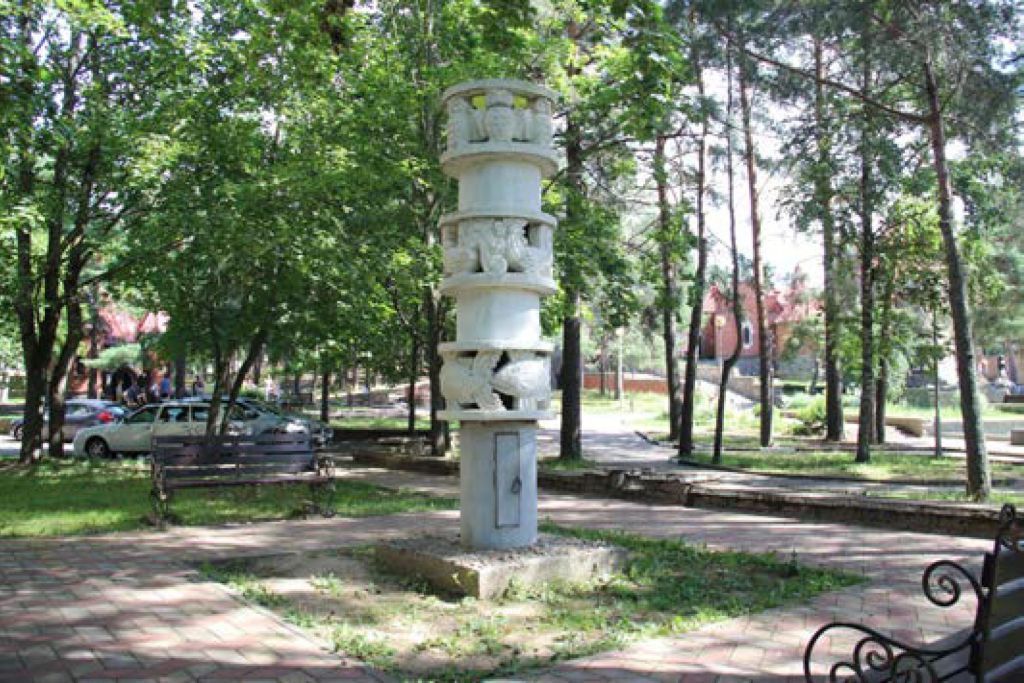 Объемно- пространственное решение:Скульптурная композиция, представляющая собой стелу с трехъярусным горизонтальным членением и горельефами на ней, на металлическом основании.Конструктивная система:Металлическое основание, блоки известняка. Архитектурно- художественное решение фасадов:Пять круглых в плане секций, установленных друг на друга. Три больших по диаметру секции оформлены горельефами.Между ними гладкие, цилиндрические секции.Верхняя-совы.Средняя — петухи.Нижняя — рыбы.Местоположение, габариты, конфигурация элементов, материалы (металл, известняк, резьба).
