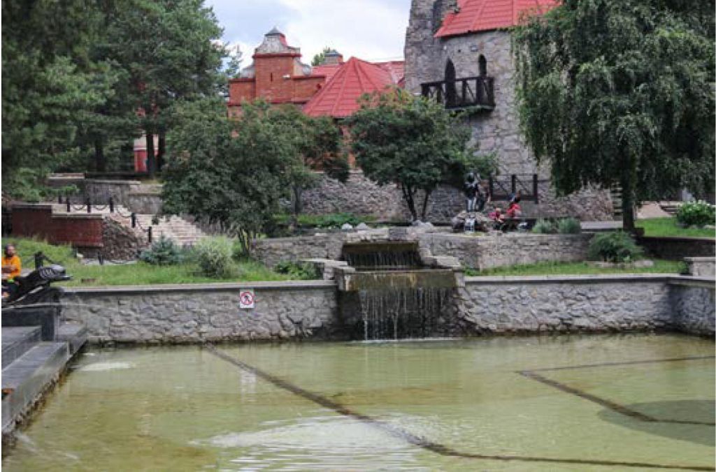 Объемно-пространственное решение:Сложный в плане бассейн из двух разновысоких частей: большая чаша около 1,5 м глубиной, меньшая расположена выше, глубиной около 0,8 м с каскадом между ними.Конструктивная система: Кладка стен бассейна из известковых блоков и с частичной облицовкой плитами полированного гранита.Подпорные стенки каскада из камня Архитектурно- художественное решение:Кладка южной, восточной и северной стенок нижнего бассейна и всех стенок верхнего бассейна из известковых блоков с обработкой в «рваной» технике с облицовкой верхней плоскости стен горизонтальными гранитными полированными плитами.Облицовка всей западной стены нижнего бассейна полированными гранитными плитами.Облицовка дна бассейна камешками и кафельной плиткой, складывающаяся в абстрактный узор.Фонтанные столбики в виде бронзовых скульптур дельфинов на западной стенке нижнего бассейна на облицованных полированными гранитными плитами постаментах.Количество (3), местоположение, материал (бронза).Стенные фонтаны в восточной стенке нижнего бассейна, в районе северной башни Арки главного входа.Количество (3), местоположение.