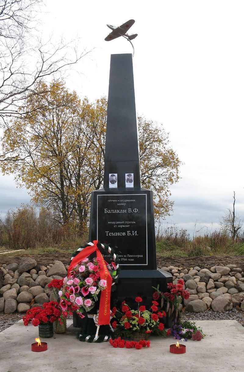Объемно- пространственное решение:Историческое пространственное и архитектурно-композиционное решение территории памятника.Габариты, местоположение, высотная отметка обелиска.Конструкции памятника:Обелиск: диабаз, полированный с памятными надписями и фамилиями погребенных летчиков.Постамент: черный полированный диабаз.Навершие: модель самолета — металл.Фундамент: бетон.Площадка памятника - диабаз.Архитектурное решение:Общее цветовое решение - черный полированный камень; Архитектурное решение обелиска, с нанесенным текстовым содержанием (цвет текста белый) и навершием в виде модели самолета.Текстовое содержание, нанесенное на постамент.На лицевой стороне обелиска два портрета на эмали.На постаменте фамилии погибших воинов «летчик-штурмовик майор Балакан В.Ф. воздушный стрелок ст.сержант Темнов Б.И.Погибли в боях за Ленинград 9 июня 1944 года»С левой стороны постамента памятная надпись «В живых вас нет Но вы живете на планете!Гордимся Вами Советской Родины Вы дети!Семья Балакан» С правой стороны постамента памятная надпись «Соколы, вы были Родине верны - мы вашим подвигом горды!Семья Балакан» Основание - диабаз полированный.С тыльной стороны обелиска установлена гранитная стена.
