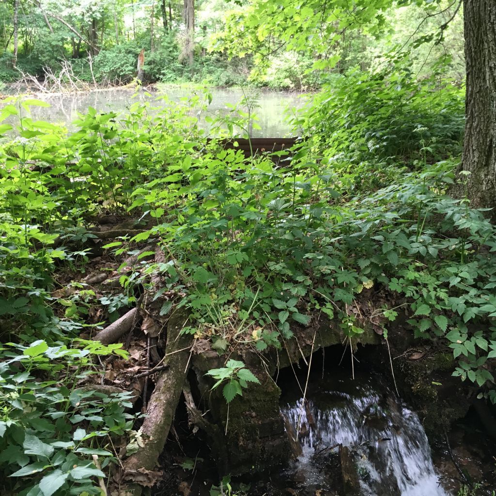 Мостик горбатый и каменное ложе протоки на каскаде в Верхнем парке