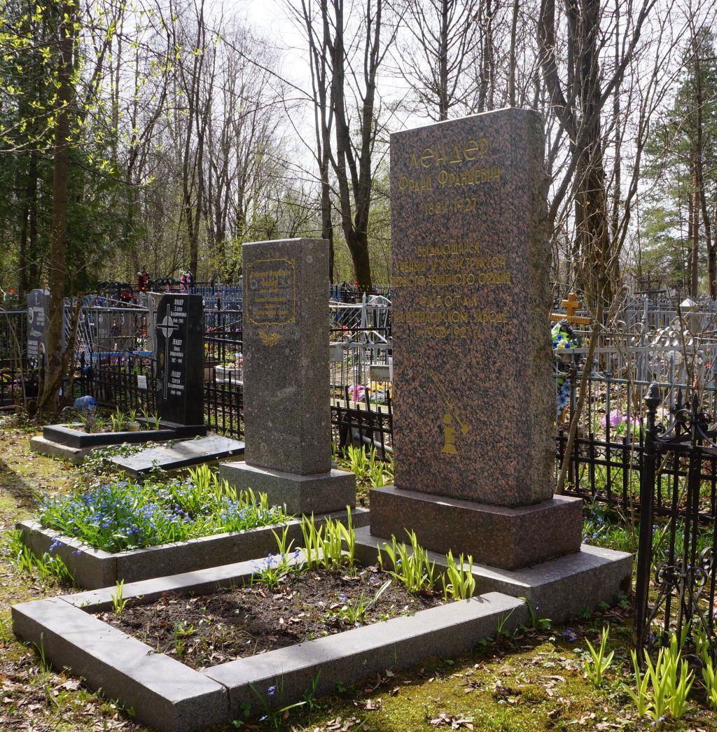 1. Объемно пространственное решение территории: местоположение в границах территории городского кладбища г. Гатчины, на пятой дорожке, на расстоянии 37,2 м к западу от Центральной аллеи; историческое пространственное и архитектурно-композиционное решение.2. Объемно пространственное решение: историческое местоположение памятника; габариты, композиция памятника, отметки высот поребрика, цоколя, пьедестала и стелы; могила вместе с соседними захоронениями обнесена металлической оградой с калиткой с северо-западной стороны.3. Архитектурно художественное решение, материалы конструкций: поребрик цветника: исторические габариты, конфигурация (прямоугольная), материал (гранит); цоколь: исторические габариты, конфигурация (прямоугольная), материал (гранит); пьедестал: исторические габариты, конфигурация (прямоугольная), материал (гранит);стела: исторические габариты, конфигурация (прямоугольная), материал (гранит), характер обработки камня; текст на северо-восточной стороне постамента: «ЛЕНДЕР Франц Францевич 1881 - 1927ВЫДАЮЩИЙСЯУЧЁНЫЙ И КОНСТРУКТОР ПЕРВОГО ЗЕНИТНОГО ОРУДИЯРАБОТАЛ НА ПУТИЛОВСКОМ ЗАВОДЕ в 1903- 1927 гг.»; местоположение, способ нанесения (гравировка), колористическое решение (окрашено в золотой цвет); схематический рисунок зенитного орудия на северо- восточной стороне постамента: местоположение, способ нанесения (гравировка), колористическое решение (окрашено в золотой цвет).