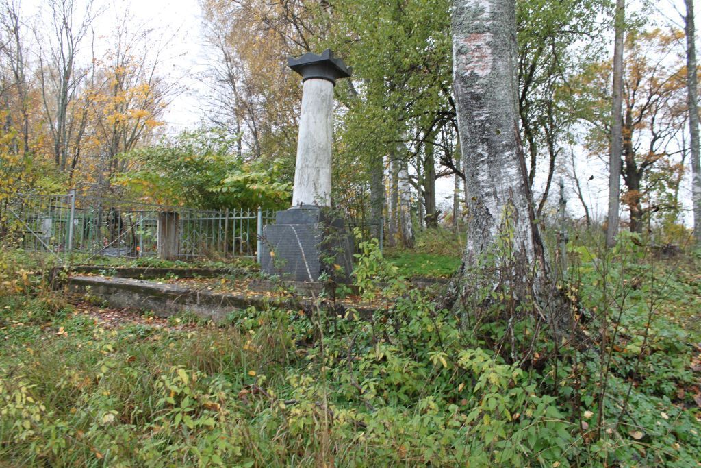 Градостроительная охрана. Местоположение объекта культурного наследия на территории старого кладбища;Архитектурно-композиционное решение: представляющее собой свободно стоящую колонну, окруженную ажурной чугунной решеткой с колонками по четырем углам и с двумя колонками с профилированной базой и завершением, напоминающим ионические капители, фланкирующими вход к могиле с западной стороны;в основании памятника – кубической формы гранитный постамент на гранитной квадратной плите; Габариты: постамент - 0,8х0,8х0,5 м; плита - 1,07х1,07х0,15 м;над постаментом - мраморная колонна с профилированной базой и плинтом в основании, гладкий белый ствол которой слегка сужается к вверху, и завершается лотосовидной чугунной капителью с абакой; Габариты: колонна - 2,35 м.на лицевой стороне постамента высечена эпитафия: «Во имя Отца и Сына и Святого духа. Здесь покоится прах усопшего раба Божия Димитрия Васильевича Лялина помещика Санкт-петербургской Губернии, Лугскаго уезда, Генерал Майора и кавалера Орденов Святаго Георгия Победоносца З и 4 классов, Святыя Анны 1 - й, 2 - й с алмазами и 4 - й на шпаге степеней. Святаго Равноагпостольного Князя Владимира, З степени и Прускаго красного Орла 2 - й, золотой шпагой с надписью «за храбрость». Серебряных медалей в память 1812 года и взятия Парижа дворянской медали 1812 года и золотого знака отличия беспорочной службы на Георгиевской Ленте, родившагося 1772 года Октября 20. скончавшегося 1847 года декабря 27 - го. Аминь».На обратной стороне памятника описан боевой путь генерала: «Сей достопочтенный Герой поступил на службу в 1786 году капралом, происходил Чинами: 1788 в подпоручики, 1789 в поручики, 1792 в капитаны, 1793 в майоры , 1799 Шефом Навагинского полка и в том же году в Подполковники, 1800 в Полковники, 1809 переходил по льду Ботнический залив. 1810 Шефом Тенгинского Мушкетерского Полка, 1812 в Генерал Майоры. Он для защиты Веры, Престола и Отечества был в 5 Морских и 27 Полевых Сражениях со Шведами и Французами, изранен пулями шведскими и картечами французскими — между многими блистательными подвигами его Славы, Увековечивает его 18 - го марта 1813 года когда при селении Романвиль близ Парижа с своим отрядом удержал Национальную Парижскую Гвардию и 4 часа сражался с французами в Виду Императора Александра 1 - го был Командиром 1 - й бригады 14 пехотной дивизии, а 28 декабря 1816 года за ранами по прошению уволен от службы».Исторический материал и характер отделки: гранит, известняк.