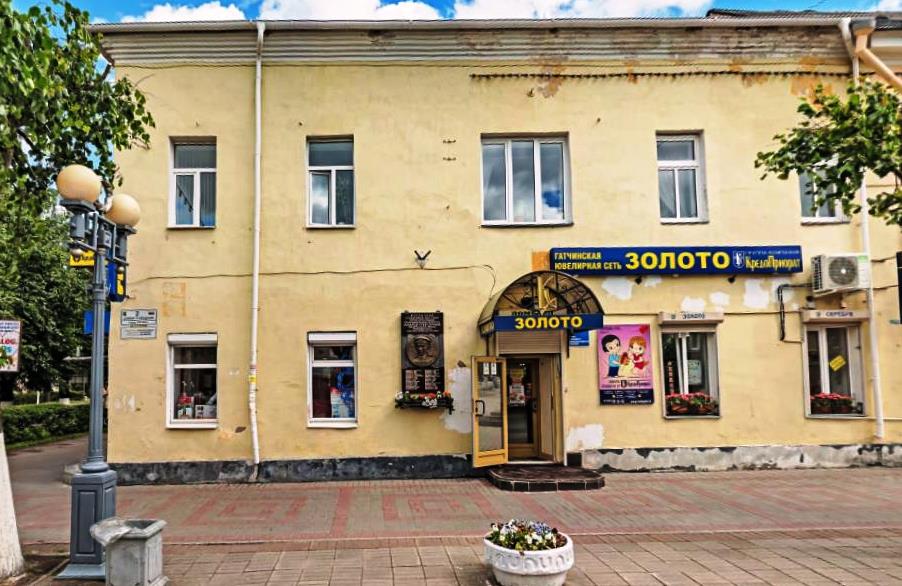 Здание, где в сентябре 1941 г. за Гатчину сражался отряд ополченцев под командованием Андрея Григорина, именем которого названа одна из улиц города. На доме установлена памятная доска