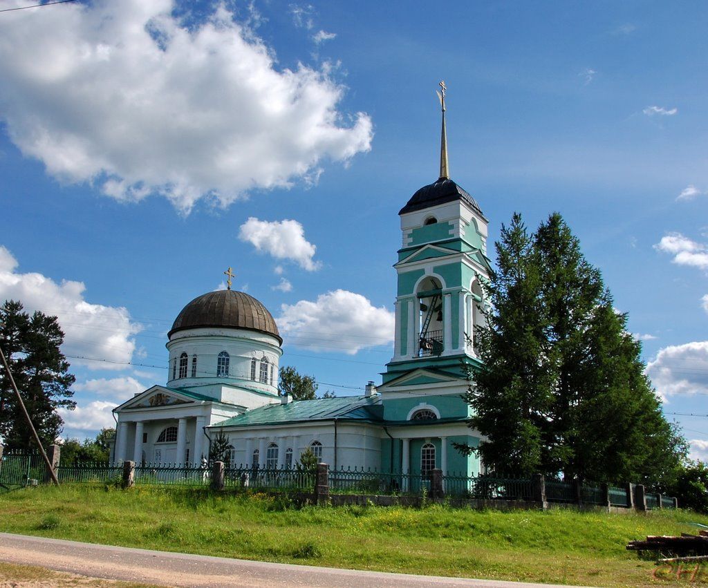 Объемнопространственное решение территории:Местоположение границ территории в восточной левобережной части села.Объемнопространственное решение:Исторические габариты и конфигурация прямоугольного в плане здания церкви с апсидой, в том числе притвор с трехъярусной колокольней, трапезная;Исторические габариты и конфигурации сводчатого купола круглого барабана, сводчатого купола колокольни со шпилем, двускатной крыши трапезной и притвора.Конструктивная система:Исторические наружные и внутренние капитальные стены (материал кирпич); Перекрытия; Конфигурация и местоположение лестницы колокольни.Объемнопланировочное решение:Объемно планировочное решение в габаритах капитальных стен.Архитектурнохудожественное решение:Материал и характер отделки фасадов: штукатурка с окраской; местоположение, габариты и конфигурация ярусов колокольни, в том числе звона;Местоположение, габариты и конфигурация оконных проемов: оконные проемы с полуциркульным завершением;Заполнение оконных проемов: деревянное, схема расстекловки – многочастная;Местоположение, габариты и конфигурация дверных проемов.Заполнение дверных проемов, материал (дерево); филенчатая дверь с резным орнаментом;Декоративное оформление фасадов;Карниз прямоугольного сечения с широким поясом трапезной и притвора;Оформление оконных проемов: замковые камни, две профилированные тяги (подоконная и надоконная) опоясывающие апсиду и соединяющиеся с архивольтами оконных проемов;Боковые фасады основного объема;Треугольный профилированный фронтон, портики в антах; ниши (арочные, прямоугольные);Центральные части боковых фасадов трапезной: четыре полукруглые пилястры;Колокольня: перспективные (с одним уступом) полуциркульные арки второго яруса;Архивольт, переходящий в профилированную тягу;Рустованные угловые лопатки;Профилированный карниз;Художественное изображение святых в нишах северного фасада здания;Художественное изображение святого в нише северной стороны апсиды.