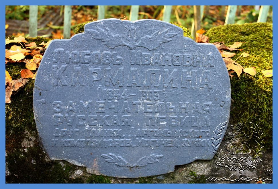 Предметом охраны объекта культурного наследия «Могила известной русской актрисы Л.И. Кармалиной», расположенного по адресу: Ленинградская область, Гатчинский муниципальный район, Кобринское сельское поселение, село Воскресенское, Воскресенское муниципальное кладбище, являются:Градостроительные характеристики:Местоположение: на кладбище в селе Воскресенское в 25 метрах от Центральной ул. села (автодорога 41 К-100 «Гатчина - Куровицы») и в 40 метрах от памятника няне А.С. Пушкина - Арине Родионовне, во второй линии захоронений вдоль проезда между улицами Центральная и Новая.Архитектурные и конструктивные характеристики:Объемно-пространственная композиция, включающая:- прямоугольный в плане (1,8 х 3,2 м) цветник из гранитных блоков. Высота блоков 0,4 м. Крепление блоков друг к другу с внешней стороны металлическими уголками на болтах;- глыба неправильной формы (габариты 1,15 х 0,3 х 0,5 м) с западной стороны захоронения;- памятная табличка округлой формы из метала с мемориальным объемным (выпуклым) текстом, закрепленная посередине «глыбы».Текст на мемориальной табличке:«ЛЮБОВЬ ИВАНОВНАКАРМАЛИНА(1834-1903)ЗАМЕЧАТЕЛЬНАЯРУССКАЯ ПЕВИЦАДРУГ ГЛИНКИ,ДАРГОМЫЖСКОГОИ КОМПОЗИТОРОВ«МОГУЧЕЙ КУЧКИ».