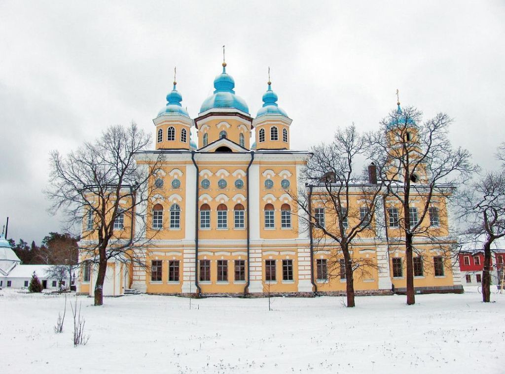 Градостроительная охрана. Расположение здания в центре монастырского комплекса; доминирующее значение в объемно-пространственной организации монастырского ансамбля с учетом его восприятия в архитектурно-ландшафтной среде и панорамных видах исторической застройки о. Коневец;главная силуэтная доминанта в ландшафте южного берега о. Коневец при восприятии с акватории Ладожского озера;Объемно-пространственное решение. Исторические габариты и конфигурация основного объема; собор двухэтажный; второй этаж центрального объема двусветный; силуэт пятиглавого храма с колокольней; высотные отметки венчающего карниза, карниза барабанов и башни, куполов; центральный объем выше апсид, трапезной и объема паперти; трехчастная апсида; крыльцо с внешним тамбуром; форма колокольни – четырехгранная в первом ярусе и восьмигранная во втором; купол колокольни восьмигранный шлемовидный; пять куполов сложной барочной формы – нижняя часть восьмигранная, полусферическая, верхняя часть аналогичной формы, но меньшего диаметра, между большой и малой полусферами глухая восьмигранная латерна, вогнутой формы; на всех куполах восьмиконечные кресты на яблоках;Конструктивная система здания. Фундамент – бутовый, ленточный; материал – камень; цоколь основного объема штукатурный; цоколь притвора облицован гранитными плитами;отмостка основного объема булыжная; отмостка вокруг притвора выполнена из лещадной плиты; наружные и внутренние капитальные стены кирпичные, на известковом растворе; внутренние столбы кирпичные; фасады оштукатурены; охраняются высотные отметки межэтажных перекрытий; тип перекрытий: в основном объеме крестовые своды на подпружных арках, барабан имеет 8-гранный купол, в трапезной и притворе – цилиндрические своды с распалубками; стропильная система деревянная; материал куполов – металл, окраска; лестница на колокольню каменная, ступени и площадки из лещадной плиты; чердачная лестница деревянная, с деревянной площадкой;Объемно-планировочное решение. Объемно-планировочное решение основного здания в уровне 1 и 2 этажа в габаритах наружных капитальных стен; местоположение лестницы на колокольню; подвал под папертью;Архитектурно-художественное решение фасадов.Архитектурно-художественное решение в стилистике переходного периода от барокко к раннему классицизму; материал и характер фасадной поверхности: фасады оштукатурены и окрашены;цветовое решение – два цвета с выделением деталей белым; местоположение и габариты исторических проемов; окна 1 этажа основного объема, окна 1 и 2 этажей паперти и трапезной, все оконные проемы апсид – прямоугольной формы; окна 2 этажа основного объема с полуциркульным завершением; окна второго света круглые; окна центрального барабана с полуциркульным завершением; окна 1 яруса колокольни круглые, 2 яруса – прямоугольные; входной проем с полуциркульным завершением;исторический рисунок расстекловки – на 8 стекол, полукруглые фрамуги на 4 стекла, круглые окна на 6 стекол; декоративное решение фасадов: первый этаж расчленен рустованными лопатками. Второй гладкими лопатками; окна первого этажа основного объема, апсид, трапезной и паперти декорированы тройным замковым камнем, профилированной подоконной доской и лучковыми сандриками; окна второго этажа декорированы тройным замковым камн
