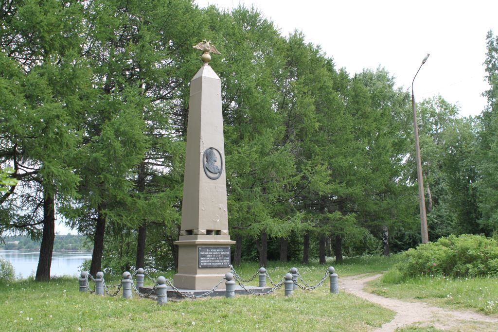 Обелиск, установленный на месте дома, в котором жил Петр I во время посещения Олонецкой верфи