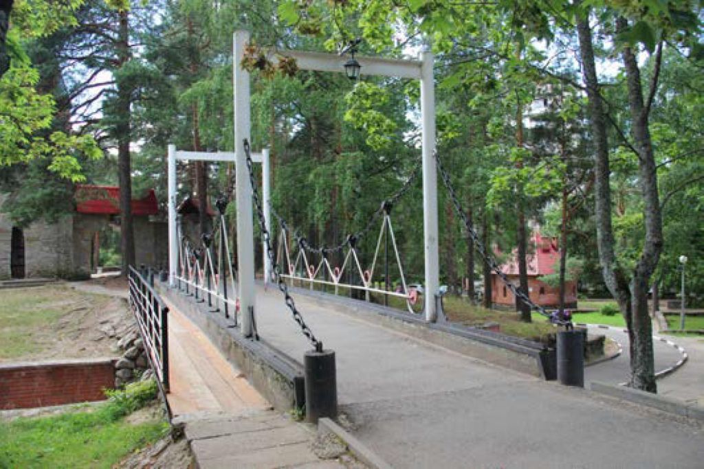 Конструктивная система:Прямое полотно, опирающееся на два берега (стороны автотрека) С восточной стороны узкий деревянный настил с металлическими перилами.Архитектурно-художественное решениеМост с декоративными вантами в виде наклонных стоек с чугунными цепями.По обоим краям моста металлические ворота из труб и балки