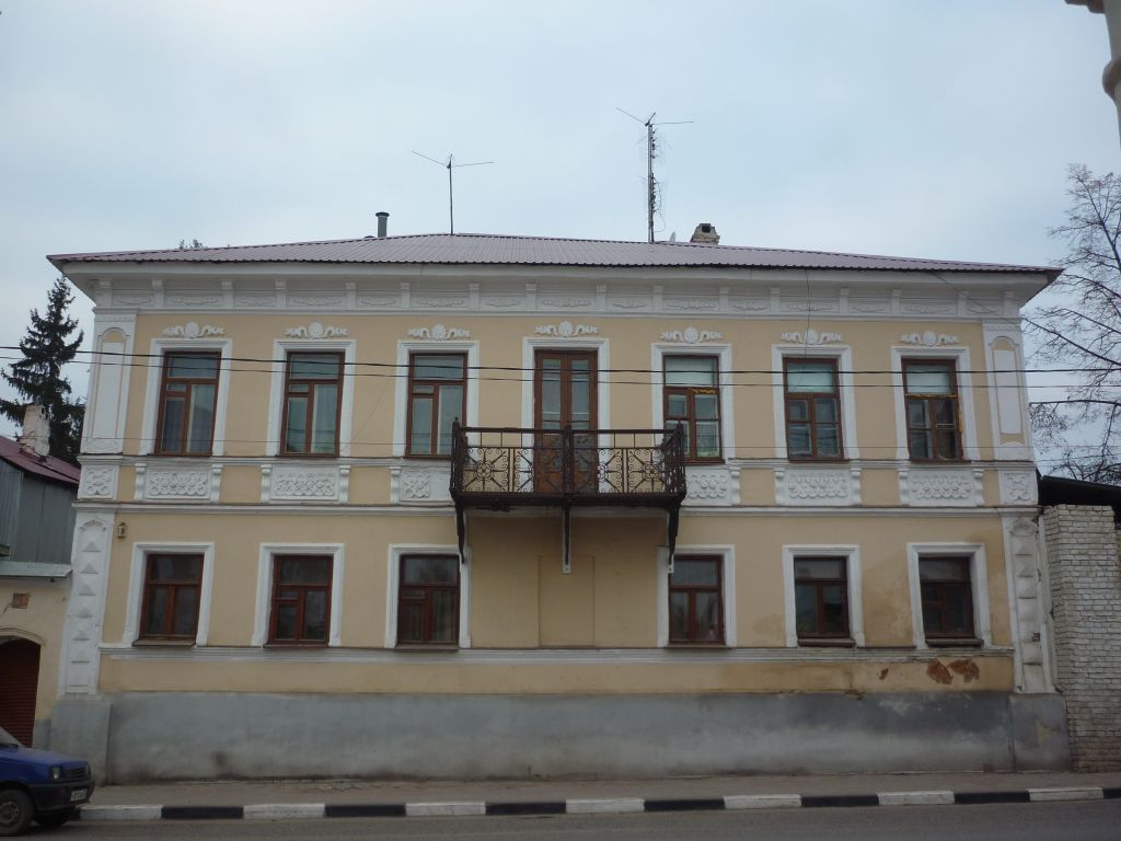 Липецкая область, г. Елец, ул. Октябрьская, 129 Местоположение: в исторической части города, по восточной линии застройки квартала, в настоящее время ограниченного улицами Л. Толстого, Октябрьской, Свердлова и Мира, главным восточным фасадом формирует красную линию застройки улицы Октябрьской. Объемно-пространственная композиция: двухэтажного здания на высоком цоколе с подвальным этажом, ориентированного по оси север-юг, с вальмовой крышей, с полукруглым выступом пристройки по южной стене в дворовой части (в редакции середины XIX в.). Композиция фасадов: - восточного (главного) - симметричная, в семь световых осей, прорезающих фасад в мерном ритме; центральная ось акцентирована балконом, расположенным на втором этаже; - южного фасада - асимметричная; членящегося окнами и нишами в мерном ритме со смещением входа в крайней западной оси согласно следующей схемы (расположение представлено с запада на восток): где О - оконный проем, Н - ниша, Н* - ниша возможно используемая под окно, Д - дверь. - западного - ассиметричная, скидывающаяся из фасадной плоскости основного объема (северная часть) и фасадной плоскости пристройки (южная часть), членящегося окнами и нишами в мерном ритме со смещением входа в крайней северной оси согласно следующей схемы (расположение представлено с севера на юг) (в редакции середины XIX в.): где О - оконный проем, 00 - двойной оконный проем, Н - ниша, Д - дверь. - северного - асимметричная, членящегося окнами и нишами в мерном ритме с устройством двери в крайнем западной проеме, более низкого по сравнению с окнами и нишами, согласно следующей схемы (расположение представлено с востока на запад ):