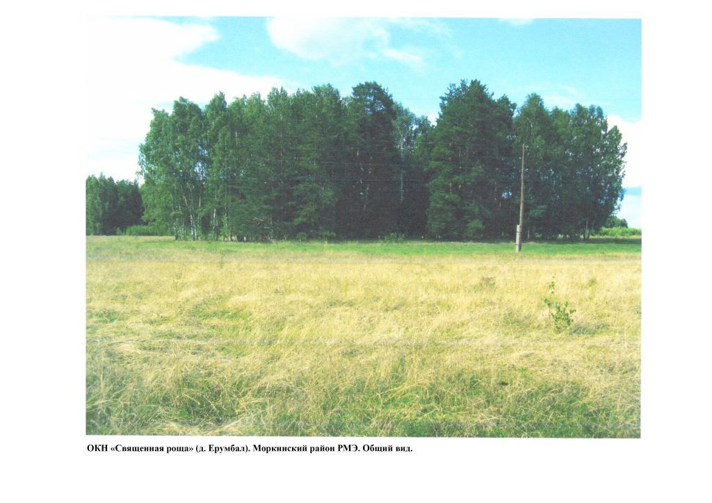 Для территории объекта культурного наследия (памятника истории и культуры) народов Российской Федерации регионального значения достопримечательное место «Священная роща», расположенного согласно сведениям Единого государственного реестра объектов культурного наследия (памятников истории и культуры) народов Российской Федерации по адресу: Республика Марий Эл, Моркинский район, в 300 м к северу от д. Ерумбал Мари-Кужерского сельсовета (уточненное местоположение объекта: Республика Марий Эл, Моркинский район, в 300 м к северу от д. Ерумбал городского поселения Морки) (далее - объект культурного наследия) в соответствии со ст. 56.4 Федерального закона от 25 июня 2002 г. № 73-Ф3 «Об объектах культурного наследия (памятниках истории и культуры) народов Российской Федерации» устанавливается следующий предмет охраны:- предметом охраны - особенностями объекта культурного наследия, подлежащими обязательному сохранению, являются его ландшафтные и объемно-пространственные характеристики, элементы благоустройства, совместные творения человека и природы, объекты, представляющие интерес с точки зрения истории, археологии, этнологии и экологии, функциональное назначение;- земельный участок в установленных границах территории объекта культурного наследия; - участок леса в установленных границах территории объекта культурного наследия;- сакральные особенности объекта культурного наследия: ритуальные площадки и деревья, связанные с жертвоприношениями и поклонением богам.