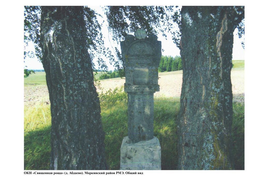 Для территории объекта культурного наследия (памятника истории и культуры) народов Российской Федерации регионального значения достопримечательное место «Священная роща», расположенного согласно сведениям Единого государственного реестра объектов культурного наследия (памятников истории и культуры) народов Российской Федерации по адресу: Республика Марий Эл, Моркинский район, в 1000 м к северо-востоку от д. Абдаево Коркатовского сельсовета (уточненное местоположение объекта: Республика Марий Эл, Моркинский район, в 1000 м к северо-востоку от д. Абдаево Коркатовского сельского поселения) (далее - объект культурного наследия) в соответствии со ст. 56.4 Федерального закона от 25 июня 2002 г. № 73-Ф3 «Об объектах культурного наследия (памятниках истории и культуры) народов Российской Федерации» устанавливается следующий предмет охраны:- предметом охраны - особенностями объекта культурного наследия, подлежащими обязательному сохранению, являются его ландшафтные и объемно-пространственные характеристики, элементы благоустройства, совместные творения человека и природы, объекты, представляющие интерес с точки зрения истории, археологии, этнологии и экологии, функциональное назначение;- земельный участок в установленных границах территории объекта культурного наследия; - участок леса в установленных границах территории объекта культурного наследия;- сакральные особенности объекта культурного наследия: ритуальные площадки и деревья, связанные с жертвоприношениями и поклонением богам.