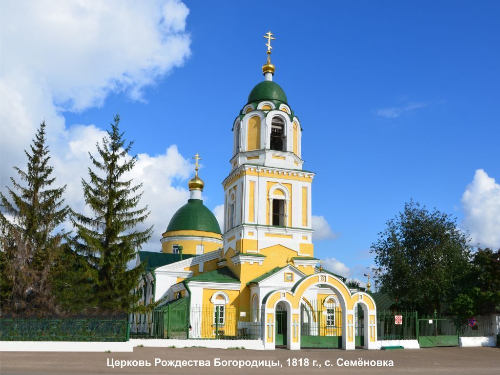 Предметом охраны объекта культурного наследия (памятника истории и культуры) народов Российской Федерации регионального значения «Церковь Рождества Пресвятой Богородицы, 1818 г.», являются:Стилистическая характеристика: - классицизм 1812-1818 годов,- эклектика и псевдорусский стиль частей храма (колокольня и фасады трапезной).Градостроительные характеристики:- местоположение и главенствующая роль здания церкви в застройке улицы Советской села Семеновки,- обзорные точки с улицы Советской и улицы Комсомольской села Семеновки, с территории церкви,- силуэтные характеристики здания церкви с параболическими (яйцевидными) куполами ротонды четверика и трехъярусной колокольни, луковицами с яблоками и крестами.Объемно-пространственная и конструктивная схема:- корабельная схема кирпичного здания церкви, включая высотные отметки по карнизам трехъярусной колокольни типа «восьмерик на четверике», крупной одноэтажной трапезной, основной части храма - четверика с ротондой и алтарной абсиды,- габариты церкви: длина 30,14 м., высота 21,6 м.,- подлинный строительный материал стен и сводов,- система и конструктивное решение кирпичных стен и сводов с железными коваными поясами и коваными воздушными связями,- габариты и конфигурации крыш и кровель здания церкви: двухскатная крыша западной паперти, скаты помещений притвора, купольная с позакомарным покрытием крыша колокольни, двухскатная крыша трапезной с северным и южным двухскатными фронтонами, четыре ската кровли четверика, купольная крыша ротонды, двухскатная с полуциркульной восточной частью крыша алтарной апсиды,- завершения куполов колокольни и ротонды: цилиндрический барабан, луковица, яблоко и восьмиконечный крест,- стропильная конструкция крыши, материал – дерево,- характер кровельного покрытия – из листового металла,- система, пропорции и конструкции прямоугольных оконных и дверных проемов на фасадах 1-го этажа здания церкви и прямоугольных оконных проемов 2-го яруса колокольни, арочных проемов и фальшпроемов 3-го яруса колокольни.Композиция и архитектурно-художественное оформление фасадов:- композиция разновеликих частей церкви: одноэтажная паперть, одноэтажные помещения притвора, 3-х ярусная колокольня, одноэтажная с центральными ризалитами трапезная, двухсветный четверик с ротондой, одноэтажный алтарь,- выступающий цоколь по периметру фасадов здания,- угловые лопатки на фасадах одноэтажной части здания церкви,- профилированные венчающие карнизы фасадов одноэтажной части здания церкви, разорванный поясок фриза трапезной,- композиция деталей фасадов двухскатной западной паперти: главный фасад с широким обрамленным арочным проемом и квадратной нишей в поле фронтона, боковые фасады с арочными обрамленными проемами и крупным рустом поверхностей ограждений,- арочные профилированные очелья оконных проемов западного, северного и южного фасадов притвора, профилированные карнизы подоконников и ниши под ними,- композиция элементов и деталей фасадов 1-го яруса колокольни: профилированный карниз и геометрический рисунок фриза, подкарнизные ниши-ширинки по углам и продольные ниши по центру фасадов, профилированный карниз с сухариками по углам 1-го яруса, примыкающие к 1-му ярусу колокольни «крылья» - скаты западного фасада трапезной с карнизами и лопаткой в поле и скаты помещ