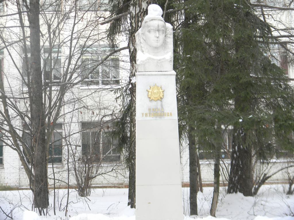 1. Градостроительные характеристики:1.1 Местоположение памятника-бюста Ольге Тихомировой, героине-партизанке на территории школы № 2 города Йошкар-Олы по улице Осипенко.1.2 Видовые характеристики объекта с разных точек обзора: точки визуального восприятия памятника с тротуаров и проезжей части улицы Осипенко; с южной части территории школы № 2.2. Объемно-пространственная и конструктивная схема:2.1 Размеры памятника: общая высота обелиска (портретный бюст, постамент, стилобат) - 354 см.2.2 Портретный бюст О. Тихомировой: высота - 86 см; материал бюста - белый мрамор.2.3 Постамент: высота - 248 см; сечение в плане 77 х 60 см; материал постамента – железобетон, облицовка белыми мраморными плитами.2.4 Стилобат: высота - 20 см; размеры в плане 246 х 246 см; материал стилобата: железобетон, облицовка серыми плитами.2.5 Подлинный монолитный железобетонный фундамент, постамента и ростверк стилобата.3. Композиция и архитектурно-художественное оформление фасадов: 3.1 Внешний облик беломраморного обелиска: портретный бюст Ольги Тихомировой, установленный на постамент, подчеркнутый барельефом в форме лаврового венка и стилобат с наклонными гранями покрытия.3.2 Барельеф на лицевой грани постамента, изображающий орден Отечественной войны;надпись, выгравированная на мраморной облицовочной плите, под барельефом «Ольга Тихомирова»; цвет ордена и надписи - под золото.4. Мемориальные особенности.4.1 Памятник монументального искусства, связанный с именем героини-партизанки О.А. Тихомировой, героически погибшей в годы Великой Отечественной войны.4.2 Автор памятника - скульптор О.А. Дедов.