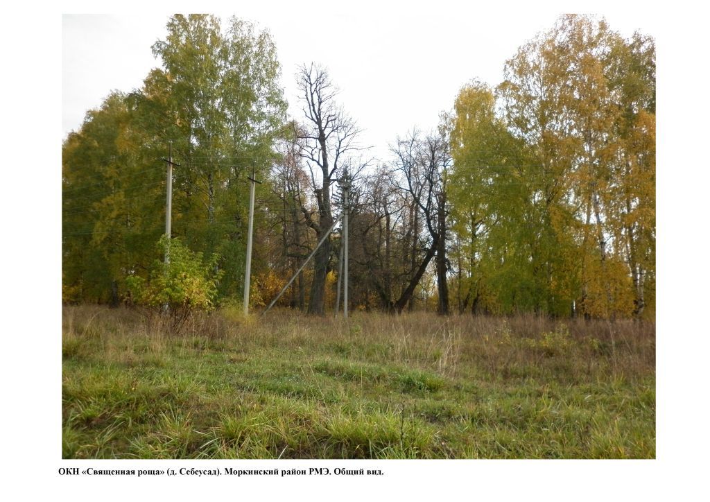 Для территории объекта культурного наследия (памятника истории и культуры) народов Российской Федерации регионального значения достопримечательное место «Священная роща», расположенного согласно сведениям Единого государственного реестра объектов культурного наследия (памятников истории и культуры) народов Российской Федерации по адресу: Республика Марий Эл, Моркинский район, в 200 м к северу от д. Себеусад (уточненное местоположение объекта: Республика Марий Эл, Моркинский район, в 200 м к северу от д. Себеусад Себеусадского сельского поселения) (далее - объект культурного наследия) в соответствии со ст. 56.4 Федерального закона от 25 июня 2002 г. № 73-Ф3 «Об объектах культурного наследия (памятниках историии культуры) народов Российской Федерации» устанавливается следующий предмет охраны:- предметом охраны - особенностями объекта культурного наследия, подлежащими обязательному сохранению, являются его ландшафтные и объемно-пространственные характеристики, элементы благоустройства, совместные творения человека и природы, объекты, представляющие интерес с точки зрения истории, археологии, этнологии и экологии, функциональное назначение;- земельный участок в установленных границах территории объекта культурного наследия; - участок леса в установленных границах территории объекта культурного наследия;- сакральные особенности объекта культурного наследия: ритуальные площадки и деревья, связанные с жертвоприношениями и поклонением богам.