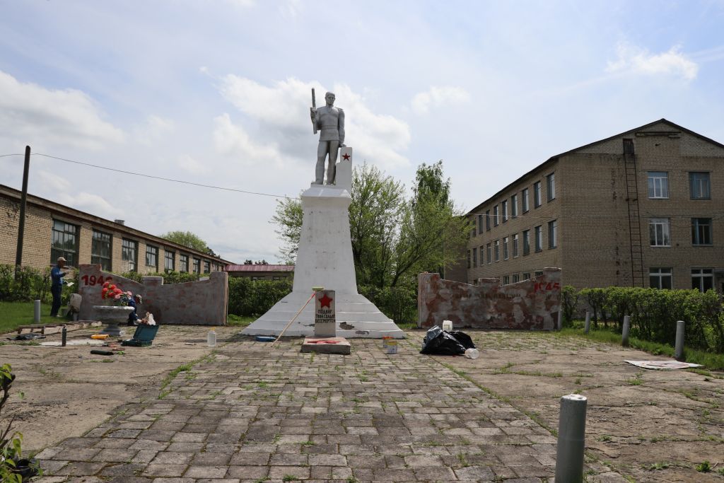 Памятник воинам, погибшим в Великой Отечественной войне 1941-1945 гг. Фигура солдата с автоматом высотой 5 м, мемориальные плиты с именами погибших. Сооружен из железобетона
