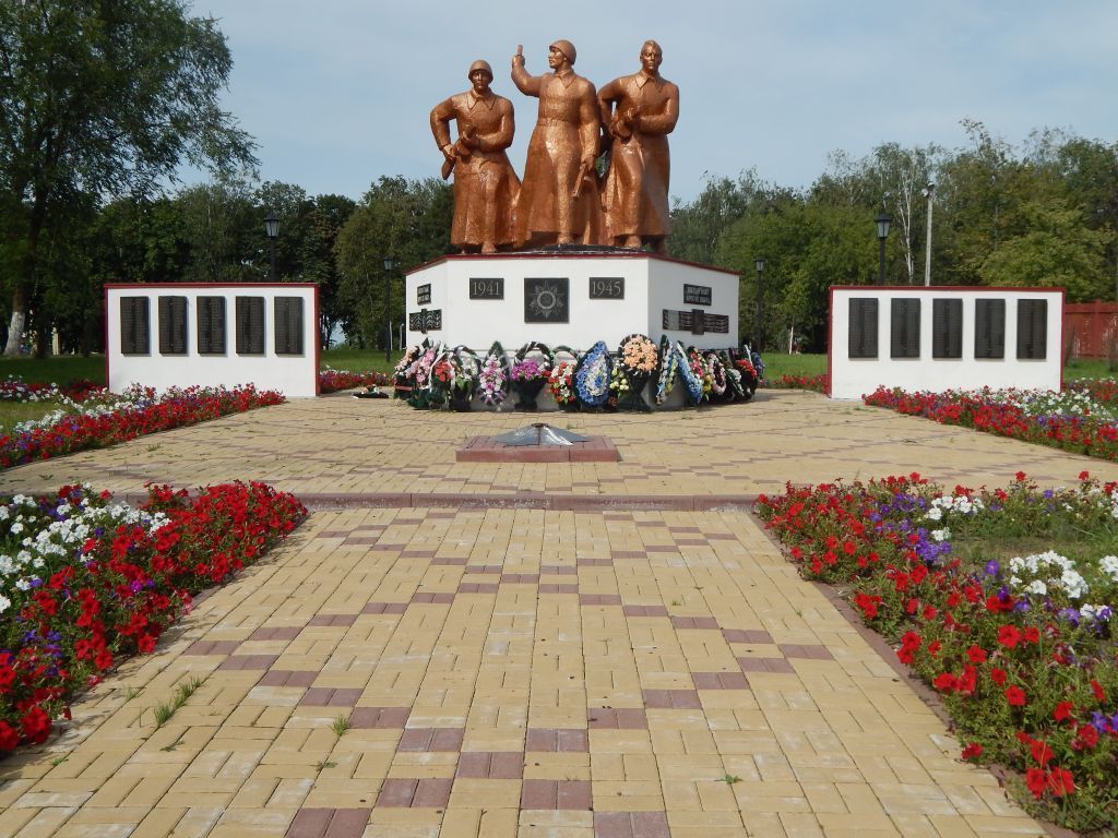 Памятник воинам, погибшим в Великой Отечественной войне 1941-1945 гг. Фигура солдата с автоматом высотой 5 м. мемориальные плиты с именами погибших. Сооружен их железобетона