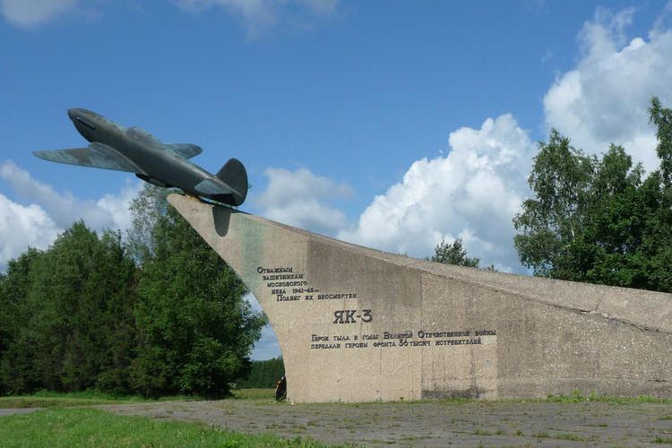 Памятный знак, установленный в честь защитников неба Москвы в 1941 г. - самолет-истребитель "ЯК-3"