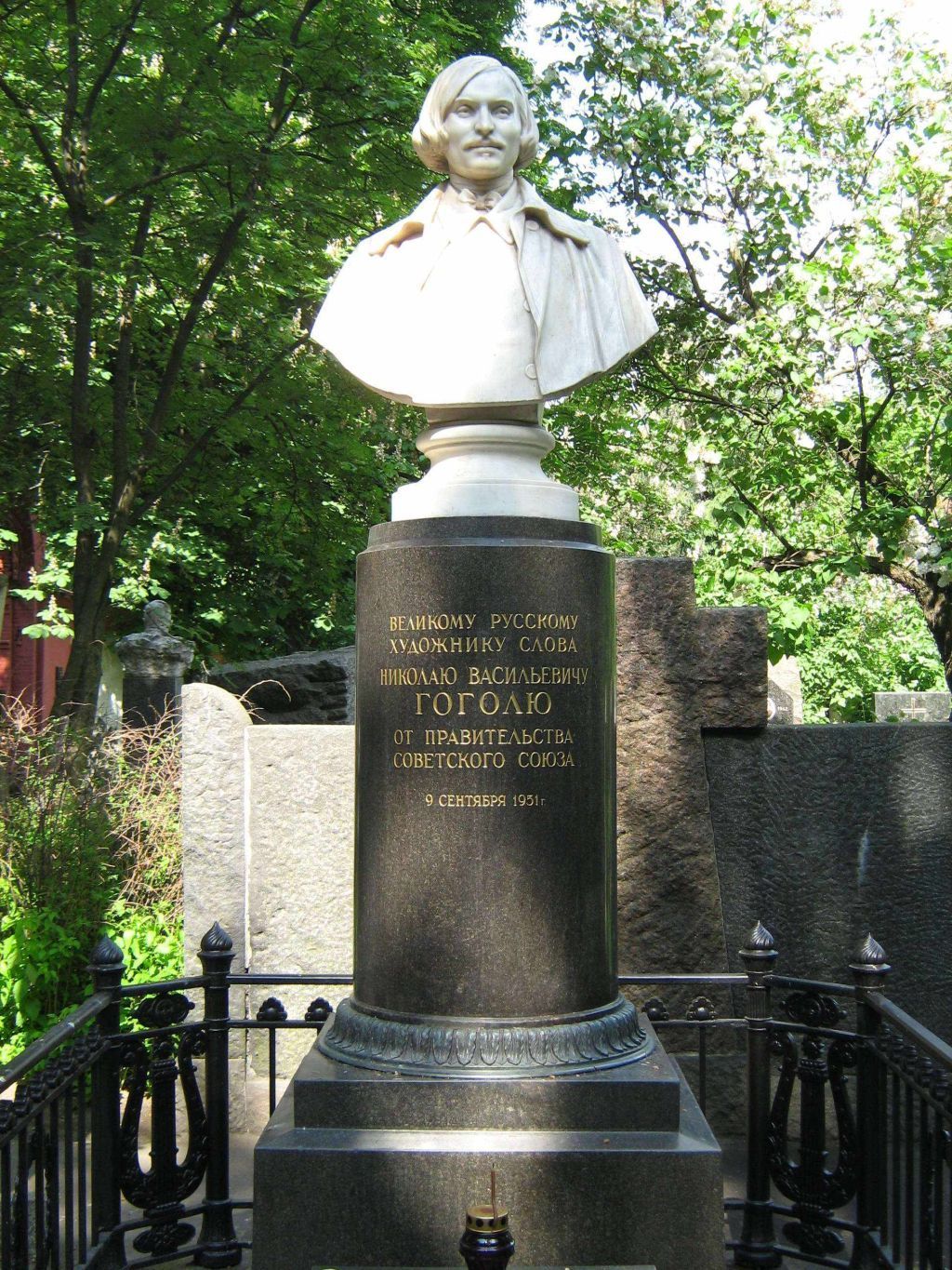 местоположение могилы с надгробием середины XIX века и оградой 1901 года (ск. Н.А.Андреев) на участке № 2, ряд 12, их роль в композиционно-планировочной структуре \"старой\" части Новодевичьего кладбища (согласно схеме предмета охраны);объемно-пространственная композиция и архитектурно-художественное решение надгробия середины XIX века, включающего отдельно стоящие каменную глыбу – \"голгофу\", увенчанную шестиконечным бронзовым крестом, и плиту-саркофаг из черного полированного гранита с памятной надписью и изречениями из Библии, выгравированными на верхней и боковых сторонах, а также основание памятника из крупных гранитных плит с выступающими и стесанными под наклоном углами, в том числе ограда, включая круглые в сечении парные столбики и решетки ограды – широкие с венками и узкие с лирами, установленные на скошенных углах и по двум боковым осям, а также местоположение, габариты и высотные отметки (согласно схеме предмета охраны); конструкция, материал (темно-серый песчаник, бронзовое литье, черный гранит, чугунное литье), характер и виды обработки поверхностей (естественная поверхность необработанного дикого камня, шлифовка, полировка, гравировка), включая установленную на верхней лицевой поверхности бронзовую табличку в форме трапеции с круглыми головками крепежа по углам и шрифтовой композицией;шрифтовая композиция на бронзовой табличке со словами: \"Ей, гряди, Господи Иiсусе. Апокал. Гл. 22, ст. 20\", выполненная рельефными буквами стилизованным старославянским шрифтом;шрифтовая композиция на плите-саркофаге с памятной надписью и изречениями из Библии: \"Здѣсь погребено тѣло НИКОЛАЯ ВАСИЛЬЕВИЧА ГОГОЛЯ РОДИЛСЯ 19го МАРТА 1809 ГОДА, СКОНЧАЛСЯ 21го ФЕВРАЛЯ 1852 ГОДА.\", на верхней плоскости саркофага; \"МУЖЪ РАЗУМИВЫЙ ПРЕСТОЛ ЧУВСТВiЯ. ПРИТЧЕЙ, ГЛ.12, СТ.23. ПРАВДА ВОЗВЫШАЕТ ЯЗЫКЪ. ПРИТЧЕЙ, ГЛ.14, СТ.34.\" на южной стороне; \"ГОРЬКИМЪ СЛОВОМЪ МОИМЪ ПОСМѣЮСЯ. iЕРИМiИ, ГЛ.20, СТ.8.\" на восточной стороне; \"ИСТИННЫМЪ ЖЕ ОУСТА ИСПОЛНИТЪ СМѣХА, ОУСТНѣ ЖЕ ИХЪ ИСПОВѣДАНiЯ. iОВА, ГЛ.8, СТ.21.\" на северной стороне.Изменение предмета охраны может быть осуществлено в порядке и случаях, предусмотренных законодательством об объектах культурного наследия.