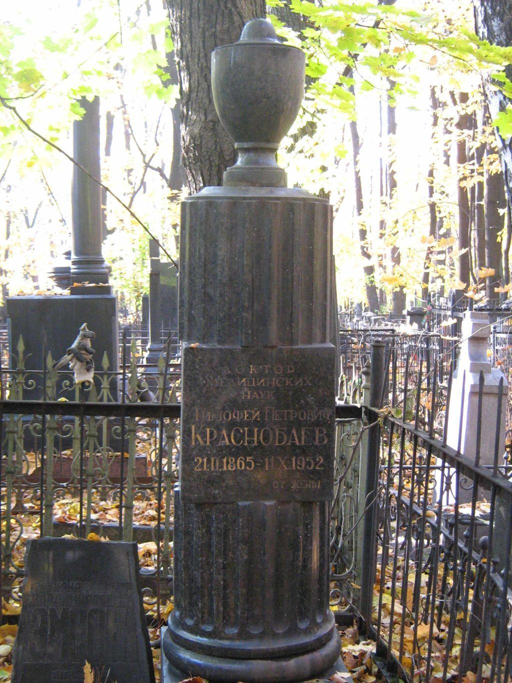 местоположение могилы с надгробным памятником середины ХХ века, расположенной на территории Введенского кладбища (согласно схеме предмета охраны);объемно-пространственная композиция и архитектурно-художественное решение надгробного памятника середины ХХ века, включая прямоугольное основание-постамент, каннелированную колонну с квадром на фусте, увенчанную урной (согласно схеме предмета охраны);конструкция, материал (лабрадорит), характер и виды обработки поверхностей (шлифовка, полировка, гравировка), колористическое решение надгробного сооружения середины XX века;шрифтовые композиции середины XX века, включая посвятительские надписи: \"ДОКТОР МЕДИЦИНСКИХ НАУК ТИМОФЕЙ ПЕТРОВИЧ КРАСНОБАЕВ 21.II.186511.Х.1952 ОТ ЖЕНЫ\" (на лицевой (восточной) стороне), \"ВЕРА ИВАНОВНА КРАСНОБАЕВА УРОЖДЕННАЯ БИЛИБИНА 13.V.1876-19. IV.1962\", на боковой (южной) стороне), включая технику нанесения (контррельеф), характер, покрытие и колористическое решение (медный цвет) шрифта (согласно схеме предмета охраны).Изменение предмета охраны может быть осуществлено в порядке и случаях, предусмотренных законодательством об объектах культурного наследия.
