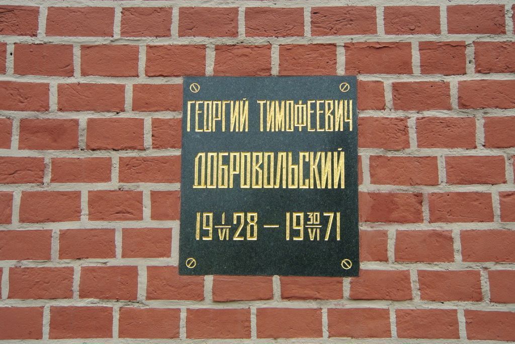 местоположение урны с прахом Добровольского Георгия Тимофеевича (1928–1971) в Кремлевской стене, между Сенатской и Спасской башнями Кремля, с левой стороны от Мавзолея В.И.Ленина (согласно приложению к настоящему предмету охраны); урна с прахом Добровольского Георгия Тимофеевича (1928–1971), ее форма, габариты, оформление; ниша в Кремлевской стене, в которой установлена урна с прахом Добровольского Георгия Тимофеевича (1928–1971), ее форма, габариты, материал;плита, закрывающая нишу с урной, ее форма, размеры (35х40 см), материал (черный гранит), колористическое решение, характер и вид обработки лицевой поверхности (полировка, гравировка) и оформление, включая декоративные винты крепления по четырем углам (согласно приложению к настоящему предмету охраны);шрифтовая композиция на плите с памятной надписью: \"ГЕОРГИЙ ТИМОФЕЕВИЧ ДОБРОВОЛЬСКИЙ 19 1/VI 28 – 19 30/VI 71\", включая технику нанесения (контррельеф), характер шрифта, покрытие и колористическое решение (золочение) (согласно приложению к настоящему предмету охраны).Изменение предмета охраны может быть осуществлено в порядке и случаях, предусмотренных законодательством об объектах культурного наследия.
