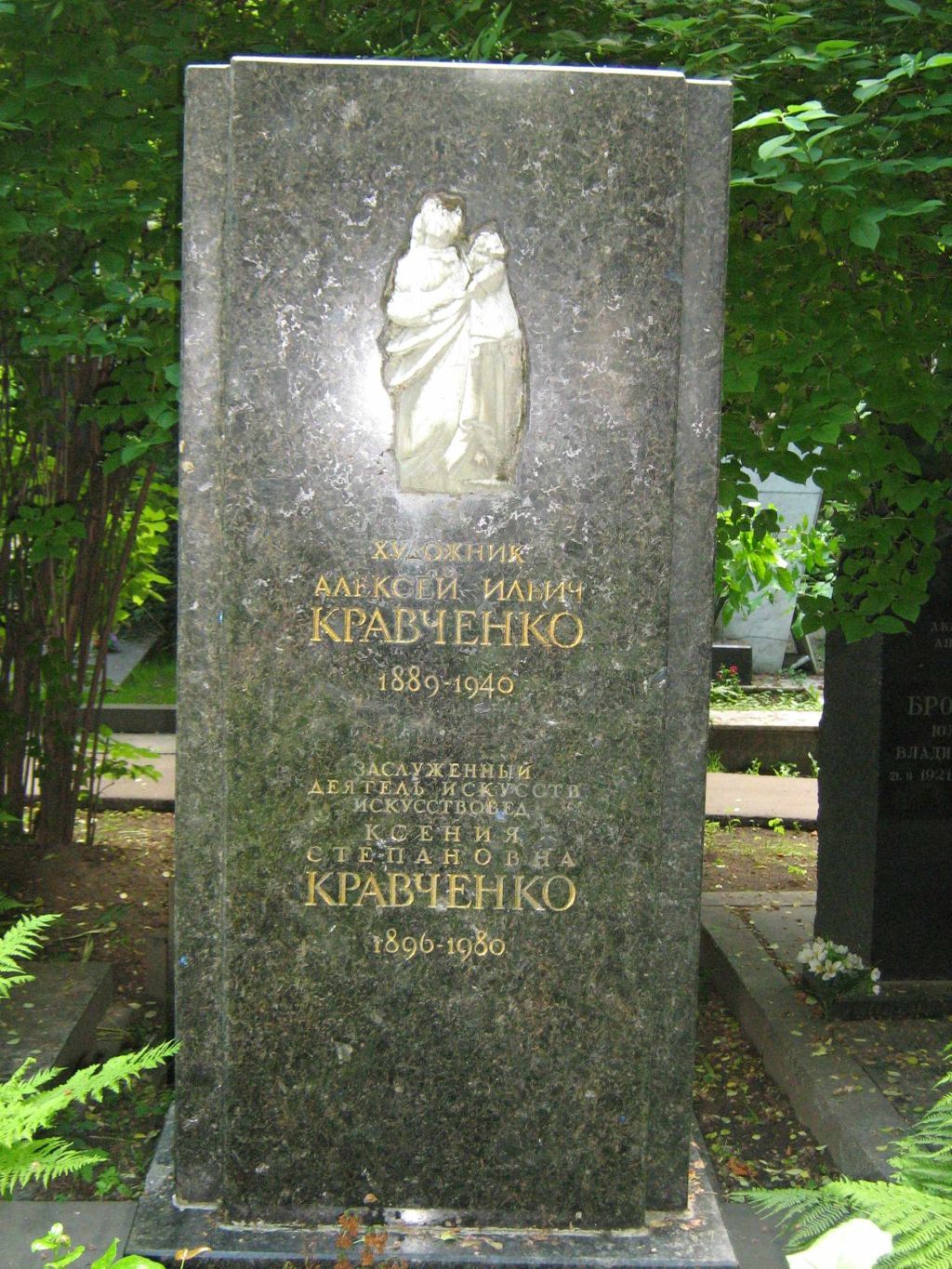 местоположение могилы с надгробием XX века в северо-восточной части Новодевичьего кладбища на участке № 2 (согласно схеме предмета охраны);объемно-пространственная композиция и архитектурно-художественное оформление надгробия XX века, прямоугольная стела с барельефом Богоматери и Младенца, прямоугольный постамент, гранитные блоки бордюра, их габариты и высотные отметки (согласно схеме предмета охраны);конструкция, материал (темно-серый с вкраплениями лабрадорит, гранит, белый мрамор), характер и виды обработки поверхностей (полировка, лощеная шлифовка, инкрустация, гравировка) надгробия XX века;шрифтовые композиции XX века со словами: \"ХУДОЖНИК АЛЕКСЕЙ ИЛЬИЧ КРАВЧЕНКО 1889-1940\" и \"ЗАСЛУЖЕННЫЙ ДЕЯТЕЛЬ ИСКУССТВ ИСКУССТВОВЕД КСЕНИЯ СТЕПАНОВНА КРАВЧЕНКО 1896−1980\", их местоположение, характер шрифта, техника нанесения и колористическое решение (золотая краска) (согласно схеме предмета охраны).Изменение предмета охраны может быть осуществлено в порядке и случаях, предусмотренных законодательством об объектах культурного наследия.