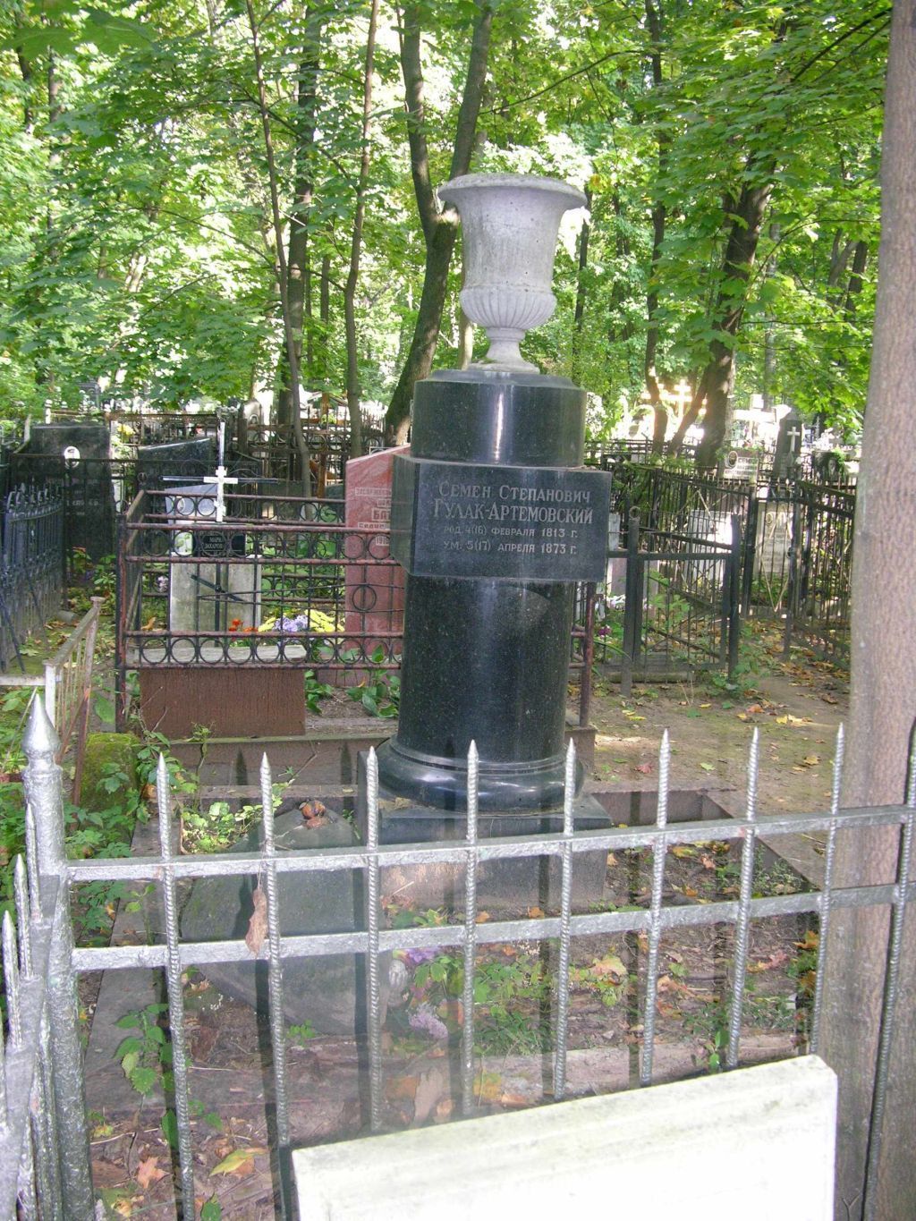 местоположение могилы с надгробным сооружением 2-й половины XIX века, 2-й половины XX века, расположенной на территории Ваганьковского кладбища, и существующие габариты надгробных сооружений на территории Ваганьковского кладбища (согласно схеме предмета охраны);объемно-пространственная композиция и архитектурно-художественное решение памятника 2-й половины XIX века, 2-й половины XX века, включая колонну, постамент, основание, базу в виде вала, полочки, урну, закладной (мемориальный) камень \"Голгофа\" на основании, блоки ограждения, в том числе их габариты и высотные отметки (уточняется в процессе реставрационных исследований) (согласно схеме предмета охраны);конструкция, материал (гранит, габбро, мрамор, известняк, песчаник), характер и виды обработки поверхностей (шлифовка, полировка, мелкобугристость, резьба, обработка \"под скалу\"), колористическое решение надгробных сооружений 2-й половины XIX века, 2-й половины XX века (уточняется в процессе реставрационных работ);шрифтовые композиции 2-й половины XIX века, 2-й половины XX века, включая посвятительские надписи: \"КОМПОЗИТОР, ПЕВЕЦ. АВТОР ОПЕРЫ \"Запорожец за Дунаем\" (на юго-восточной стороне квадра колонны), \"СЕМЕН СТЕПАНОВИЧ ГУЛАК-АРТЕМОВСКИЙ РОД. 4(16) ФЕВРАЛЯ 1813 Г. УМ. 5(17) АПРЕЛЯ 1873 Г.\" (на юго-западной стороне квадра колонны), \"ГОСПОДИ ПРiИМИ ДУХЪ ЕГО СЪ МИРОМЪ. СЕМЕНЪ СТЕПАНОВИЧЬ АРТЕМОВСКiЙ-ГУЛАКЪ СКОНЧАЛСЯ 6 АПРѢЛЯ 1873 ГОДА 58 ЛѢТЪ.\" (на фронтальной стороне голгофы), включая технику нанесения, характер и колористическое решение шрифта (врезка) (уточняется в процессе реставрационных работ).Изменение предмета охраны может быть осуществлено в порядке и случаях, предусмотренных законодательством об объектах культурного наследия.