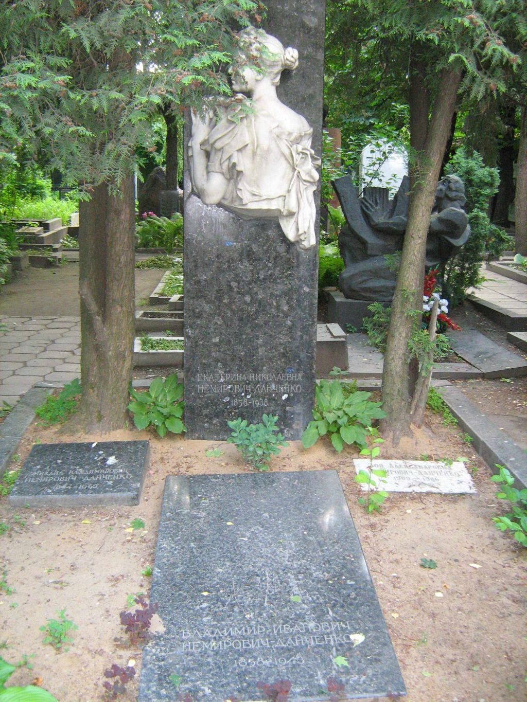 местоположение могилы с надгробием, расположенной на участке № 2, ряд 15, в северо-западной части Новодевичьего кладбища, в границах семейного захоронения (согласно схеме предмета охраны);объемно-пространственная композиция и архитектурно-художественное оформление семейного захоронения Немировичей-Данченко, включая ограждение в виде сплошного бортика из шлифованных блоков темно-серого гранита, установленный по оси у восточной границы надгробный памятник на могиле жены Екатерины НиколаевныНемирович-Данченко (урожденной баронессы Корф), представляющий прямоугольную стелу из черного полированного гранита с беломраморным рельефным портретом и памятной надписью в нижней части: \"ЕКАТЕРИНА НИКОЛАЕВНА НЕМИРОВИЧ-ДАНЧЕНКО 1858–1938\", а также расположенные перед ним надгробные плиты, в том числе на могиле В.И.Немировича-Данченко перед стелой, включая габариты и высотные отметки, его конструкцию, материал, характер, виды обработки поверхностей, колористическое решение (согласно схеме предмета охраны);надгробная плита на могиле Немировича-Данченко Владимира Ивановича, горизонтально установленная прямоугольная в плане,с памятной надписью в нижней части: \"ВЛАДИМИР ИВАНОВИЧ НЕМИРОВИЧ-ДАНЧЕНКО 1858–1943\", выполненной контррельефом светлыми буквами на темном фоне, включая материал и виды обработки поверхностей (темно-серый шлифованный лабрадорит, гравировка) (согласно схеме предмета охраны);первоначальная надгробная плита на могиле Немировича-Данченко Владимира Ивановича, установленная с тыльной стороны надгробия Е.Н.Немирович-Данченко, представляющая доску из белого мрамора с выгравированной памятной надписью: \"ВЛАДИМИР ИВАНОВИЧ НЕМИРОВИЧ-ДАНЧЕНКО\" в верхней выступающей части, в том числе рельефная композиция с изображением двух пучков лавровых веток, перевязанных лентами в нижней части, включая ее местоположение, габариты, материал и виды обработки поверхностей (белый мрамор, шлифовка, гравировка, резьба) (согласно схеме предмета охраны).Изменение предмета охраны может быть осуществлено в порядкеи случаях, предусмотренных законодательством об объектах культурного наследия.