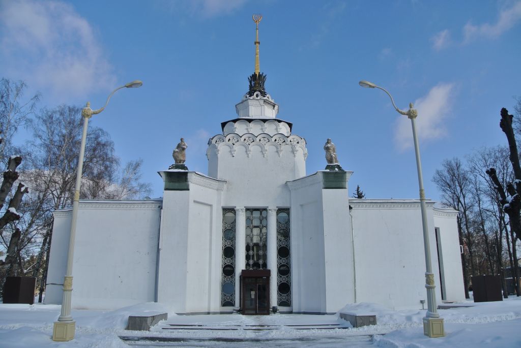 местоположение и градостроительные характеристики здания, расположенного на искусственном насыпном подиуме с открытыми площадками и лестницами, его роль в композиционно-планировочной структуре ВДНХ (согласно схеме предмета охраны);объемно-пространственная композиция здания 1954 года, состоящая из прямоугольного со скошенными передними углами в плане объема, увенчанного ступенчатым завершением с шатром и шпилем, включая открытые террасы у главного и боковых фасадов, в том числе высотные отметки по венчающим карнизам (согласно схеме предмета охраны);крыши, шатер, купол с четырехгранным шпилем 1954 года, их конструкция, материал и характер кровельного покрытия, высотные отметки по конькам;композиционное решение и архитектурно-художественное оформление фасадов 1954 года, включая местоположение, форму, размеры, оформление оконных и дверных проемов, барельефы на главном фасаде, лепной картуш над главным входом, две фигуры, изображающие девушек-колхозниц со снопом, статуи на парапете центрального объема, рельефный орнамент входного портала, кокошники, завершающие ярусы шатра, венчающий карниз, сквозной металлический купол и декоративный венец в основании шпиля, завершение шпиля эмблемой с изображением серпа и молота в венке из листьев, их конструкция, материал и техника исполнения, открытые наружные лестницы, два фонтана 1954 года в круговых чашах, примыкающих к углам главного фасада, в том числе скульптурные водометные устройства, их местоположение, композиция, габариты, форма, архитектурное и художественное оформление, материал и техника исполнения (согласно схеме предмета охраны);материал и характер отделки фасадной поверхности 1954 года, включая гладкую и терразитовую штукатурку;колористическое решение фасадов 1954 года;пространственно-планировочная структура интерьеров здания 1954 года в пределах капитальных стен и перекрытий (согласно схеме предмета охраны);капитальные стены и перекрытия 1954 года, их материал и конструкции (согласно схеме предмета охраны);лестницы 1954 года, их местоположение, материал и оформление (согласно схеме предмета охраны);архитектурно-художественное оформление интерьеров 1954 года, включая покрытия полов, декоративное оформление стен, в том числе лепные орнаментальные обрамления проемов, рельефные орнаментальные фризы, профилированные тяги, в том числе лепные кессонированные потолки вводного зала (согласно схеме предмета охраны);колористическое решение интерьеров 1954 года;характер заполнения оконных и дверных проемов 1954 года, включая фигурные металлические рамы витража и обрамление входной группы на главном фасаде, их характер оформления, материал, конструкция, техника исполнения, колористическое решение. Изменение предмета охраны может быть осуществлено в порядке и случаях, предусмотренных законодательством об объектах культурного наследия.