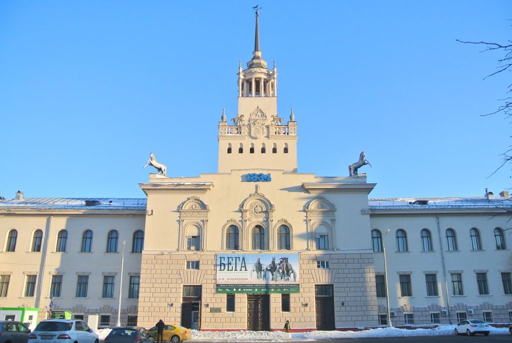 местоположение и градостроительные характеристики здания конца XIX века, середины XX века, участвующего в формировании фронтальной застройки Беговой аллеи, его роль в композиционно-планировочной структуре ансамбля (согласно схеме предмета охраны);объемно-пространственная композиция двухэтажного здания конца XIX века, середины XX века, с цокольным и подвальным этажами, трехъярусной башней с открытым балконом-галереей и бельведером со шпилем, малыми входными группами, восьмиколонным портиком центрального входа, с фронтоном, аттиком, квадригой и скульптурами лошадей, а также двухъярусные трибуны, объемы \"царской ложи\" и судейной, открытые лестницы, в том числе полукруглые, высотные отметки по венчающим карнизам, фронтону, аттикам, парапетам, парапетным столбикам, пинаклям и шпилю с флюгером (согласно схеме предмета охраны);крыши середины XХ века, их конструкция, конфигурация, материал, характер кровельного покрытия, включая двухъярусное купольное завершение бельведера башни и козырек над трибунами, высотные отметки по конькам (уточняется по результатам реставрационных исследований);композиционное решение и архитектурно-художественное оформление фасадов здания 1898–1899 годов, 1951–1955 годов, включая местоположение, размер, форму и оформление оконных и дверных проемов, в том числе архивольты, треугольные, прямоугольные и арочные сандрики, подоконные полочки, витражи, фактурный руст с замками, порталы боковых входов с полуколоннами коринфского ордера, архивольтами над арочными проемами, розетками, аттиком с пинаклями и лепным декором в виде растительных гирлянд и картушем в центре; глубокий портик с двумя рядами колонн коринфского ордера, антаблементом, декорированным рельефным фризом, поясом иоников и кронштейнов под карнизной плитой большого выноса, высоким аттиковым парапетом с наложенным на него ложным фронтоном с лепным картушем в тимпане и скульптурными горельефами по бокам, фигурными аттиками над ними, парапетные столбики с вазонами и пинаклями, растительный и орнаментальный лепной и резной декор, а также скульптура в завершении – центральная квадрига и фигуры двух коней, кессонированный с лепниной сводчатый потолок портика с лепными розетками, филенками, поясами и фризами; перспективный с профилировкой и лепными вертикальными поясами портал парадного входа, а также полукруглые боковые подиумы межуровневой лестницы, декорированные широким рельефным фризом и профилированным карнизом; пристенный фонтан в виде рельефного полихромного панно \"Кони на водопое\", а также плоские арочные ниши по боковым граням фасадной стены с барельефами в виде высоких ярусных вазонов с растительными мотивами, медальоны с изображениями наездников; оформление трехъярусной башни со шпилем, включая квадровую фактурную рустовку, ордерные композиции в оформлении центрального и боковых окон первого яруса, каннелированные коринфские пилястры с архитравами и архивольтами с рельефными вставками и лепниной, центральный ступенчатый аттик и венчающие карнизы по углам с двумя фигурами коней на постаментах, пояс арочных нишек с окошками второго яруса башни, завершающий его сквозной парапет из столбиков, вазонов и балясника, включая центральный рельефный картуш с фигурным фронтоном со звездой в тимпане, а также фигуры коней с всадника