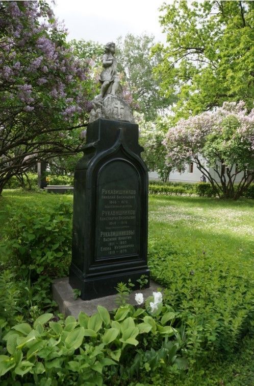 местоположение могилы с надгробием Н.В.Рукавишникова, К.В.Рукавишникова, В.Н.Рукавишникова, Е.К.Рукавишниковой, их роль в композиционно-планировочной структуре некрополя Новодевичьего монастыря (согласно схеме предмета охраны);объемно-пространственная композиция и архитектурно-художественное решение надгробия конца XVIII – второй половины XIX века, 1950-х годов, включая базу-основание – прямоугольную в плане плиту, стелу с профилированным цоколем, филенками с килевидным завершением на продольных сторонах и фигурным верхом с венчающей скульптурой (мальчик в легкой рубашке, стоящий на скале, на которой лежит раскрытая книга, на скале вытесан четырехконечный (латинский) крест) (согласно схеме предмета охраны), габариты и высотные отметки;конструкция, материал, характер обработки (фактура) и колористическое решение надгробия конца XVIII – второй половины XIX века, 1950-х годов: база-основание из тесаного светло-серого камня, стела из полированного черного гранита с крупными вкраплениями; скульптура из белого мрамора;мемориальные посвятительные надписи на лицевой (восточной) стороне стелы: \"Рукавишников Николай Васильевич 1846–1875 Общественный деятель, Рукавишников Константин Васильевич 1848–1915 Общественный деятель, Рукавишниковы Василий Никитич 1811–1883, Елена Кузминична 1818–1879\", включая их местоположение, характер оформления (техника врезки) (согласно схеме предмета охраны).Изменение предмета охраны может быть осуществлено в порядке и случаях, предусмотренных законодательством об объектах культурного наследия.