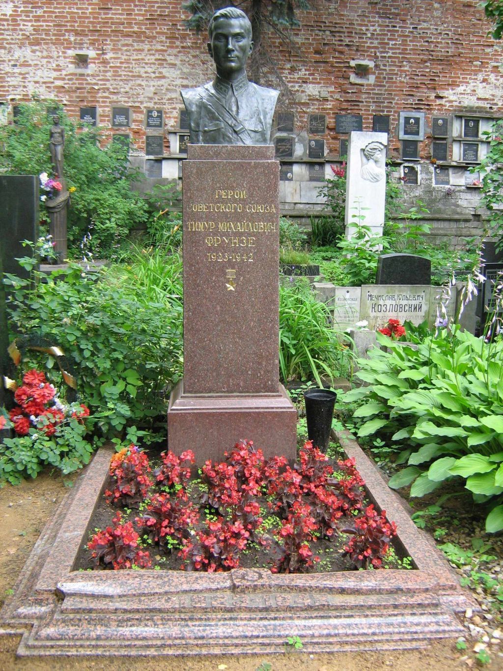 Предметом охраны объекта культурного наследия федерального значения (памятника) \"Надгробие Т.М.Фрунзе\", 1948 г. являются:местоположение надгробия 1948 года (скульптор Ж.Кишфалуди-Штробль), расположенного на \"старой\" территории Новодевичьего кладбища, на участке № З, ряд 63 (согласно приложению к настоящему предмету охраны); объемно-пространственная композиция и архитектурно-художественное оформление памятника 1948 года на могиле летчика-истребителя, Героя Советского Союза Фрунзе Тимура Михайловича (1923 - 1942), включая бронзовый бюст - скульптурный портрет героя; постамент из красного полированного гранита с подрезкой в верхней части и цоколем внизу, оформленным профилировкой на стыке; ограждение могилы профилированным бортиком, с рельефным изображением двухлопастного пропеллера с датами \"1923-1942\" на верхней плоскости борта с южной стороны, а также габариты и высотные отметки сооружения, в том числе ограждение семейного захоронения бортиком из брусков полированного черного гранита на бетонном основании, с межуровневыми ступенями и парапетным ограждением со стороны аллеи по центральной оси (согласно приложению к настоящему предмету охраны); конструкция, материал (бронза, красный и черный гранит), характер и виды обработки (фактура) поверхностей (литье, полировка, резьба, гравировка); шрифтовая композиция на лицевой стороне постамента с памятной надписью:\"ГЕРОЙ СОВЕТСКОГО СОЮЗА ТИМУР МИХАЙЛОВИЧ ФРУНЗЕ 1923-1942” и изображение медали \"Золотая Звезда\", включая технику нанесения (контррельеф), характер и покрытие (золочение) шрифта, колористическое решение (согласно приложению к настоящему предмету охраны).Изменение предмета охраны может быть осуществлено в порядке и случаях, предусмотренных законодательством об объектах культурного наследия.