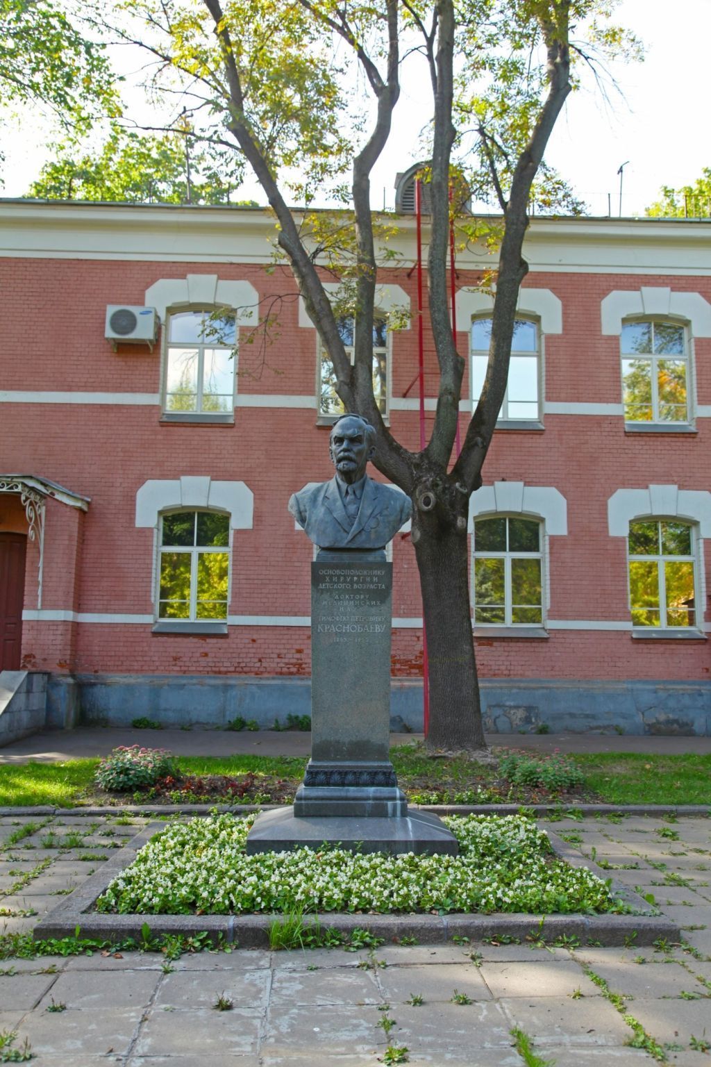 местоположение и градостроительные характеристики памятника1955 года, расположенного на территории Морозовской детской больницы, перед восточным фасадом корпуса № 9, напротив исторического Хирургического корпуса № 8, его роль в композиционно-планировочной структуре владения и квартала (согласно схеме предмета охраны);объемно-пространственная композиция и архитектурно-художественное оформление памятника 1955 года, включающая квадратноес повышением основание из гранитных плит, квадратный в сечении постамент из полированного серого гранита с профилированным цоколем и фризовым поясом из аканта, и литой бронзовый бюст Т.П.Краснобаева, включая габариты и высотные отметки сооружения, в том числе площадку памятникас цветником в обрамлении из бортового камня (согласно схеме предмета охраны и материалам фотофиксации элементов предмета охраны);конструкция, материал (полированный гранит, литая бронза), характер и виды обработки поверхностей, колористическое решение памятника1955 года;шрифтовая композиция на лицевой стороне постамента – \"Основоположнику хирургии детского возраста, доктору медицинских наук Тимофею Петровичу Краснобаеву 1865–1952\" (согласно материалам фотофиксации элементов предмета охраны).Изменение предмета охраны может быть осуществлено в порядкеи случаях, предусмотренных законодательством об объектах культурного наследия.
