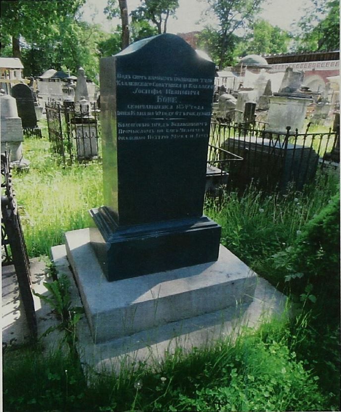 местоположение могилы с надгробием первой половины XIX века, ее роль в композиционно-планировочной структуре некрополя Донского монастыря (согласно схеме предмета охраны);объемно-пространственная композиция и архитектурно-художественное решение надгробия первой половины XIX века, включающие прямоугольное основание с архитектурным обломом – типа \"обратный гусек\", прямоугольную стелу с криволинейным завершением (по типу голгофы), их габариты и высотные отметки (согласно схеме предмета охраны);конструкция, материал (темно-серый полированный гранит), фактура и характер обработки надгробия первой половины XIX века;колористическое решение надгробия первой половины XIX века;шрифтовая композиция на лицевой стороне стелы со словами: \"Подъ симъ камнемъ положено тѣло Коллежского Совѣтника и Кавалера Iосифа Ивановича Бове скончавшеися 1834го года iюня 16 дня на 49 году отъ рождения Благоговѣю предъ Всевышнимъ Промысломъ но какъ Человѣкъ Оплакiваю Потерю Мужа и Друга\", включая характер шрифта, технику нанесения (согласно схеме предмета охраны);местоположение и форма лунки под крепеж утраченного креста на завершении стелы надгробия первой половины XIX века. Изменение предмета охраны может быть осуществлено в порядкеи случаях, предусмотренных законодательством об объектах культурного наследия.