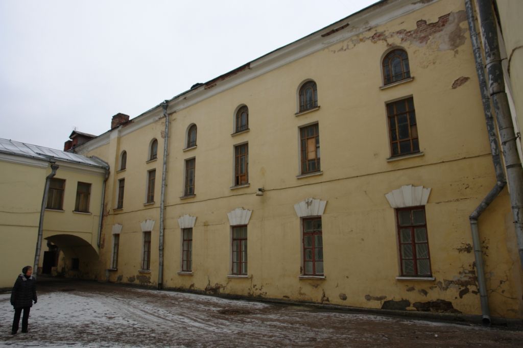 Учебные корпуса с интерьерами (строение 1):местоположение и градостроительные характеристики здания, участвующего в формировании фронта застройки Красноказарменной улицы и Красноказарменной набережной, его роль в композиционно-планировочной структуре застройки ансамбля и квартала;объемно-пространственная композиция трехэтажного частью четырехэтажного здания П-образной усложненной конфигурации в плане, включающая три одноэтажных объема первой четверти XIX века, надстроенные вторыми этажами и объединенные встройками и пристройками 1830-х годов, а также три круглые двух- и трехэтажные башни с переходами 1830-х годов и надстроенные третий и четвертый этажи конца 1940-х – начала 1950-х годов основного объема, в том числе высотные отметки по венчающим карнизам и торцевым фронтонам;крыши на середину XX века, их конфигурация, материал, характер кровельного покрытия, включая высотные отметки по конькам, в том числе печные и вентиляционные трубы, слуховые окна;композиционное решение и архитектурно-художественное оформление фасадов здания XIX века, включая размер, форму, местоположение, оформление оконных и дверных проемов, цоколь, горизонтальную и квадровую рустовку первого этажа, веерные замки над окнами, креповки фасадных плоскостей, рамочные плоские наличники оконных проемов с сандриками и подоконными фартуками, подоконные полочки, арочные ниши заложенных въездов на главном фасаде с рустованным полуциркульным архивольтом, трехчастным окном в люнете и фигурной профилированной филенкой под ним, белокаменный венчающий карниз над вторым этажом, а также элементы декоративного оформления надстроенных этажей конца 1940-х – начала 1950-х годов: в том числе высокие пилястры на постаментах, объединяющие окна третьего и четвертого этажей, в том числе на торцевом главном фасаде, а также рамочные наличники оконных проемов, профилированные подоконные тяги, венчающие карнизы с гладкими фризами, торцевые фронтоны;материал и характер отделки фасадных поверхностей XIX века, конца 1940-х - начала 1950-х годов: ленточный и квадровый руст, рустованные архивольты, гладкая штукатурка с окраской, белокаменный декор;колористическое решение фасадов;характер оформления столярных заполнений оконных и дверных проемов XIX века, конца 1940-х - начала 1950-х годов;пространственно-планировочная структура интерьеров здания XIX века, конца 1940-х - начала 1950-х годов в пределах капитальных стен, пилонов, колонн, прямоугольных и арочных проемов, сводчатых перекрытий;капитальные стены, пилоны, колонны и перекрытия XIX века, конца 1940-х - начала 1950-х годов, их конструкция и материал, включая сводчатые перекрытия с распалубками;лестницы XIX века, конца 1940-х - начала 1950-х годов, их местоположение, конструкция, материал, характер оформления, включая металлическиеограждения лестничныхмаршей сдеревянными профилированными поручнями и глухие деревянные ограждения с филенками и парапетными столбиками;архитектурно-художественное оформление интерьеров здания XIX века, конца 1940-х - начала 1950-х годов, включая колонны и колоннады большого и малого ордера с антаблементами и карнизами с лепными фризами, филенки с лепными розетками в оформлении парадных помещений и двусветного зала, в том числе балкон с балясником ограждения, а также арочные ниши, профилированные карнизы потолков, двустворча