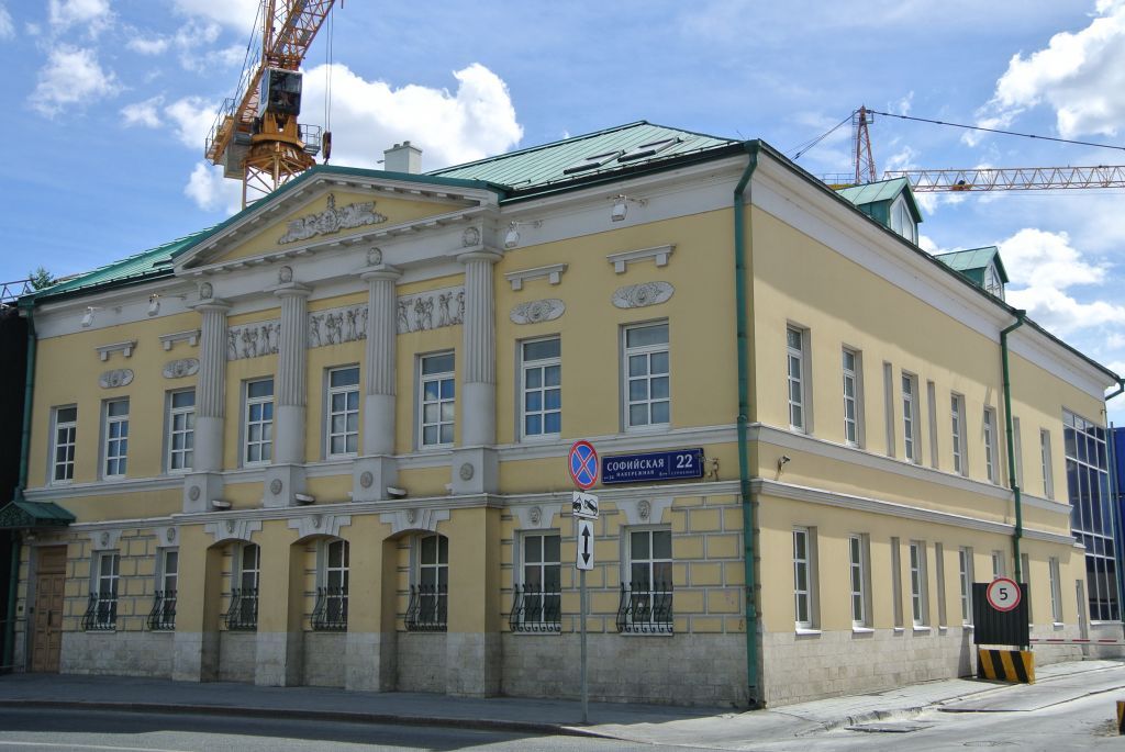местоположение и градостроительные характеристики здания, участвующего в формировании фронта застройки Софийской набережной, его роль в композиционно-планировочной структуре квартала (согласно схеме предмета охраны);объемно-пространственная композиция двухэтажного с подвалом здания XIX – начала XX века, в том числе высотные отметки по венчающему карнизу и фронтону (согласно схеме предмета охраны);композиционное решение и архитектурно-художественное оформление фасадов XIX – начала XX века, включая размер, форму, местоположение и оформление оконных и дверных проемов, в том числе четырехколонный портик дорического ордера с треугольным фронтоном, в тимпане которого лепной декор в виде грифонов, руст первого этажа, барельефы между колоннами в уровне второго этажа, над окнами крыльев второго этажа лепные розетки и белокаменные сандрики, над окнами первого этажа – веерные замковые камни с маскаронами, междуэтажный, подоконный и венчающий карнизы (согласно схеме предмета охраны); материал и характер отделки фасадных поверхностей XIX – начала XX века, в том числе цоколь, облицованный белокаменной плиткой, и лепной декор, руст, гладкая штукатурка с окраской; колористическое решение фасадов XIX – начала XX века (уточняется в процессе реставрационных исследований); пространственно-планировочная структура интерьеров здания XIX – начала XX века в пределах капитальных стен и перекрытий (уточняется в процессе реставрационных исследований; согласно схеме предмета охраны);капитальные стены XIX – начала XX века, их конструкция и материал (согласно схеме предмета охраны);местоположение лестницы начала XX века (согласно схеме предмета охраны);характер оформления столярных заполнений оконных и дверных проемов на XIX век, включая материал и колористическое решение.Изменение предмета охраны может быть осуществлено в порядке и случаях, предусмотренных законодательством об объектах культурного наследия.
