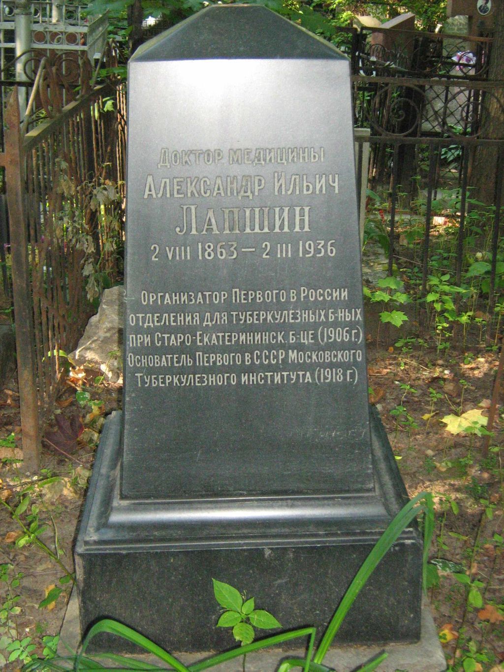 местоположение могилы с надгробием первой половины XX века, в западной части Введенского кладбища на участке № 11 (согласно схеме предмета охраны);объемно-пространственная композиция и архитектурно-художественное оформление надгробия первой половины XX века, включая стелу с усеченным пирамидальным завершением, профилированный цоколь, цветочницу, четыре столбика с отверстиями и металлическими кольцами под крепеж цепей ограждения, их габариты и высотные отметки, включая местоположение и форму лунки под крепеж завершения надгробия (согласно схеме предмета охраны);конструкция, материал (черный гранит), характер и виды обработки поверхностей (полировка, гравировка) надгробия первой половины XX века;шрифтовая композиция на лицевой стороне стелы первой половины XX века со словами: \"Доктор медицины Александр Ильич Лапшин 2 VIII 1863 – 2 III 1936 Организатор Первого в России отделения для туберкулезных б-ных при Старо-Екатерининск. б-це (1906 г.) Основатель Первого в СССР Московского Туберкулезного института (1918 г.)\", ее местоположение, характер шрифта, техника нанесения и колористическое решение (согласно схеме предмета охраны).Изменение предмета охраны может быть осуществлено в порядке и случаях, предусмотренных законодательством об объектах культурного наследия.