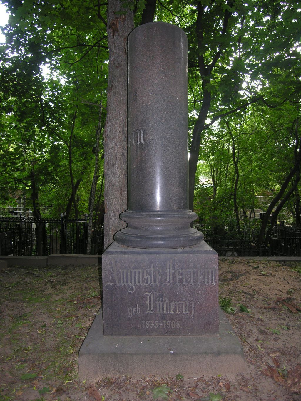 местоположение надгробия конца XIX в. на могиле Феррейн Августы Ивановны (1835–1906 гг.), жены К.И.Феррейна, на семейном захоронении Феррейнов, на участке № 5-1, в среднем ряду у восточной границы (согласно приложению к настоящему предмету охраны);объемно-пространственная композиция и архитектурно-художественное решение надгробия конца XIX в. на могиле Феррейн Августы Ивановны (1835–1906 гг.), представляющего выполненную из темно-розового тонко шлифованного гранита усеченную колонну с профилированной базой на кубоватом постаменте с фаской по верхней грани из того же камня, включая плиту-основание из песчаника (согласно приложению к настоящему предмету охраны), в том числе габариты и высотные отметки сооружения;конструкция, материал (темно-розовый гранит, песчаник), характер (фактура) и виды обработки поверхностей (полировка, шлифовка, гравировка), колористическое решение;шрифтовая композиция на колонне с лицевой (южной) стороны с памятной надписью: \"Sophie Ferrein\", включая технику нанесения (контррельеф), характер шрифта, покрытие (золочение) (согласно приложению к настоящему предмету охраны);шрифтовая композиция на постаменте с лицевой (южной) стороны с памятной надписью: \"Carl Ferrein\", включая технику нанесения (контррельеф), характер шрифта, покрытие (золочение) (согласно приложению к настоящему предмету охраны);шрифтовая композиция на постаменте на восточной стороне с памятной надписью: \"Auguste Ferrein geb. Juderitz 1835–1906\", включая технику нанесения (контррельеф), характер шрифта, покрытие (золочение) (согласно приложению к настоящему предмету охраны);шрифтовая композиция на постаменте с северной стороны со словами: \"Unseren theuren unvergesslichen Eltern in dankbarer Wiebe.\", включая технику нанесения (контррельеф), характер шрифта, покрытие (золочение) (согласно приложению к настоящему предмету охраны).Изменение предмета охраны может быть осуществлено в порядке и случаях, предусмотренных законодательством об объектах культурного наследия.