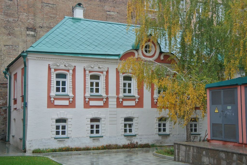 Местоположение и градостроительные характеристики здания XVII (?)-XVIII вв. 1870-1880 гг., его роль в композиционно-планировочной структуре ансамбля монастыря. Объемно-пространственная композиция прямоугольного в плане, двухэтажного здания XVII (?)-XVIII вв. и пристройкой 1870-1880 гг., в том числе высотные отметки по венчающему карнизу и фигурному фронтону. Крыша XIX в., ее конфигурация, материал, характер кровельного покрытия, в том числе высотные отметки по коньку кровли, включая слуховые окна (с учетом реставрации 1980-х гг.). Композиционное решение и архитектурно-художественное оформление фасадов, включая размер, форму, местоположение, оформление оконных и дверных проемов, в том числе высокий цоколь облицованный белым камнем; частью рустованные лопатки, рустованное обрамление с замками окон первого этажа, прямоугольные подоконные нишки первого этажа, наличники окон второго этажа с фигурными полуколонками, сандриком с разорванным волютообразным фронтоном, а также прямоугольными подоконными филенками, венчающий карниз с поясом сухариков, фигурный фронтон с валютами и килевидным кокошником с круглым окном в тимпане (с учетом реставрации 1980-х гг.). Материал и характер отделки фасадных поверхностей: цоколь облицованный белым камнем, обмазка и окраска по кирпичу. Колористическое решение фасадов (уточняется по результатам реставрационных исследований и раскрытий). Пространственно-планировочная структура интерьеров здания в пределах капитальных стен, прямоугольных и арочных проемов и перекрытий XVIII в. 1870-1880 гг. Капитальные стены и перекрытия XVIII в. 1870-1880 гг., их конструкции и материал. Архитектурно-художественное оформление интерьеров (уточняется и дополняется по результатам реставрационных исследований и раскрытий). Характер оформления столярных заполнений оконных и дверных проемов на XIX в. (с учетом реставрации 1980-х гг.). Предмет охраны может быть уточнен при проведении натурных реставрационных исследований.