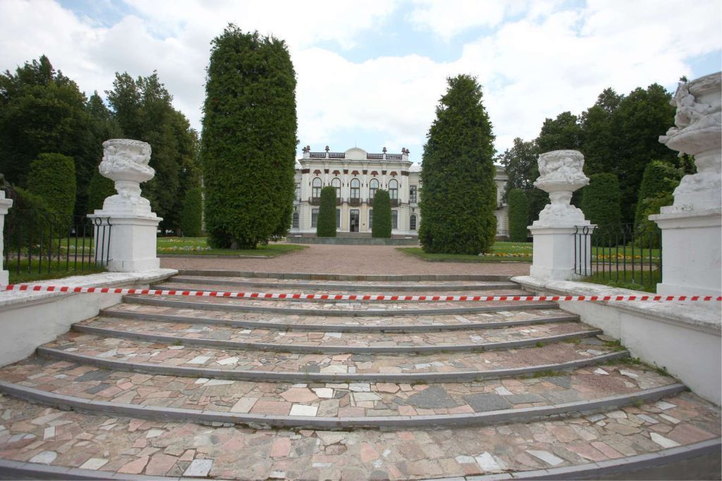 Пространственная композиция партера с местоположением фонтана в центре и променадом вдоль балюстрады;местоположение двух утраченных деревянных павильонов, фланкированных по краям пространство цветочного партера;архитектурно-художественное оформление фасада балюстрады в сочетании кладки из кирпича и деталей и кладки из белого камня.