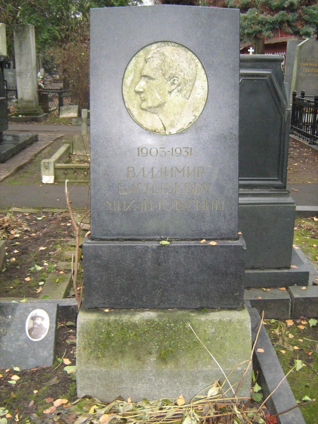 местоположение надгробия на участке № 2, ряд № 9 на \"старой\" территории Новодевичьего кладбища (согласно приложению к настоящему предмету охраны);объемно-пространственная композиция и архитектурно-художественное оформление надгробия 1931 года (скульптор Н.А.Андреев), включающие трапециевидную стелу черного тонко шлифованного гранита с барельефным профильным портретом В.В.Михайловского из белого нешлифованного мрамора в круглой нише, цокольное основание стелы, постамент светло-серого гранита, их габариты и высотные отметки (согласно приложению к настоящему предмету охраны);конструкция, материал (черный и светло-серый гранит, белый мрамор), характер и виды обработки поверхностей (тонкая и фактурная шлифовка, резьба, гравировка), колористическое решение надгробия 1931 года;шрифтовая композиция 1931 года: \"1903-1931 ВЛАДИМИР ВАСИЛЬЕВИЧ МИХАЙЛОВСКИЙ\", ее местоположение, характер шрифта, способ нанесения (контррельеф), покрытие (золочение), колористическое решение (согласно приложению к настоящему предмету охраны).Изменение предмета охраны может быть осуществлено в порядке и случаях, предусмотренных законодательством об объектах культурного наследия.