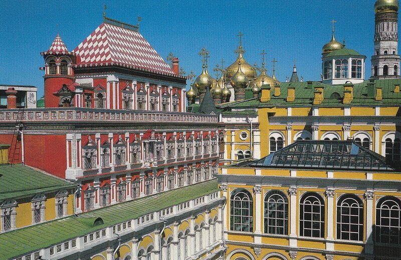 Теремной дворец с Верхоспасским собором. Первый и второй ярусы дворца - части Дворца Василия III, сооружены на белокаменном подклете 1395 г. Золотая Царицына палата. Третий, четвертый и пятый ярусы - дворец Михаила Федоровича и церковь Спаса за золотою ре